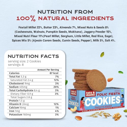 This Combo contains 150 gms of each pack of Millet & Jaggery Cookies - Mighty Iron and Folic Fiesta. Healthy tasty and nutrient-rich cookies made by using 100% natural ingredients. Good fats carbohydrates and proteins come together in dry fruits seeds and wholesome millet grain Butter & Jaggery bind them together and provide natural sweetness Contains No refined sugar No Maida No Baking powder No Baking soda No Maltodextrin and No eggs. No refined sugars No Maida No Baking powder No Baking soda No Maltodextrin and No eggs. Contains 12-15 cookies per pack.