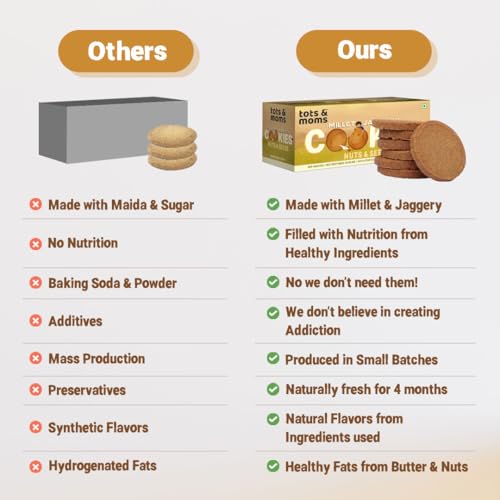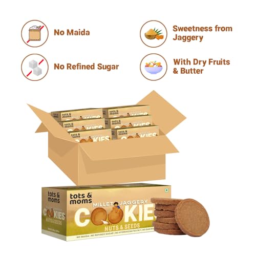 HomeGrocerySnacksCookiesTots & Moms Millet & Jaggery Cookies | No Sugar No Junk Guilt free snack for kids | Pack of 6-150g each (Nuts & Seeds (Pack of 6))