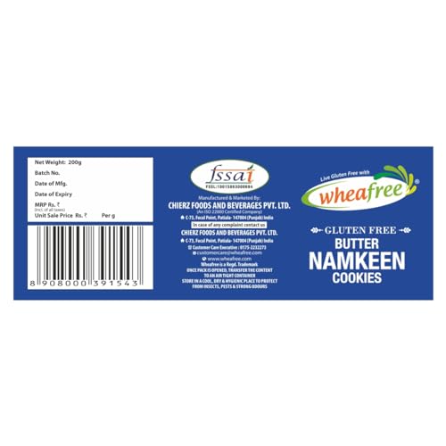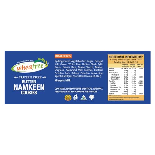 Wheafree Gluten Free Butter Namkeen Cookies - Tasty and Certified Gluten Free.These cookies have now become an ideal companion for tea time. It can be consumed as snacks with morning or evening Tea/Coffee or can be combined with other recipes. We cater to a wide range of gluten-free products made in a contamination-free environment. Wheafree cookies and biscuits are manufactured to provide safe and healthy food options to people suffering from intolerance towards Gluten. Wheafree cookies and biscuits are free from grains like Wheat Barley Oats Rye and are made in 100% Gluten-free environment. We have made these multi-seed cookies and biscuits not only to take care of your nutritional needs but also to satisfy your craving for tasty and delicious snacks requirement.