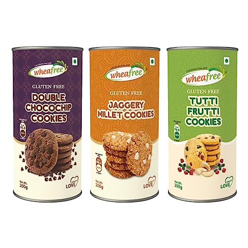 Jaggery Millet Cookies - Healthful Delights! Experience the perfect harmony of health and flavour with our thoughtfully crafted cookies. We have carefully blended a combination of Sorghum (Jowar) Amaranth Pearl Millets (Bajra) Bengal Split Gram Jaggery and Desi Ghee to create a truly nourishing treat. These cookies are a guilt-free snacking option as they are naturally sweetened with Jaggery instead of refined sugar. Packed with the goodness of Millets and the added benefits of Bengal Split Gram our cookies provide a good source of fiber vitamins and minerals. Perfect for gluten-free and vegetarian diets our Millet Jaggery Cookies are a delightful way to honour tradition while promoting overall well-being. Treat yourself to these healthful delights and savour each bite with the goodness of Millets Jaggery and Desi Ghee! Enjoy Jaggery Millet Cookies with your family.Wheafree Tutti Frutti Cookies are an indulgent treat for you to experience the rich fruity taste in every bite. The Cookies are filled with tutti frutti cherries and cashews that burst out of the surface. Make the moments special and share the joy with our scrumptious pack of Wheafree Tutti Frutti cookies and delight your loved ones with our irresistibly tempting cookies. Enjoy them whenever you feel like and fix your mood instantly. They go very well with tea and coffee so now you have an everyday snack that you can relish. Wheafree Double Chocochip Cookies are an indulgent treat for you to experience the rich taste of chocolate in every bite. Our Double Chocochip cookies get ready to take yourself on a delightful chocolicious journey. The Cookies are filled with chocolate chips that burst out of the surface. They are blended into the crunchy cookie in a such a way that every bite will be a mouthful of chocolate.