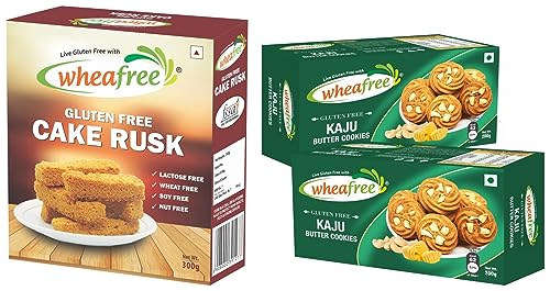 Wheafree Gluten Free Kaju Butter Cookies - Pack of 2 (200g each) | No Maida | Tasty Crunchy and Flavoured Cookies | Best Teatime Snacks | 100% VegetarianWheafree Gluten Free Kaju Butter Cookies (Pack of 2 - 200g each)These cookies have now become an ideal companion for tea time. It can be consumed as snacks with morning or evening Tea/Coffee or can be combined with other recipes. We cater to a wide range of gluten-free products made in a contamination-free environment. Wheafree cookies and biscuits are manufactured to provide safe and healthy food options to people suffering from intolerance towards Gluten. Wheafree cookies and biscuits are free from grains like Wheat Barley Oats Rye and are made in 100% Gluten-free environment. We have made these multi-seed cookies and biscuits not only to take care of your nutritional needs but also to satisfy your craving for tasty and delicious snacks requirement.Wheafree Gluten Free Cake Rusk (300 Grams) Non-Veg | Tasty Crunchy and Crispy | Best Tea Time Snacks | No Maida | 100% Wholesome IngredientsGluten Free Cake Rusk - 300gmOur Cake Rusk is crunchy and crispy. They are the perfect tea/coffee time snacks.