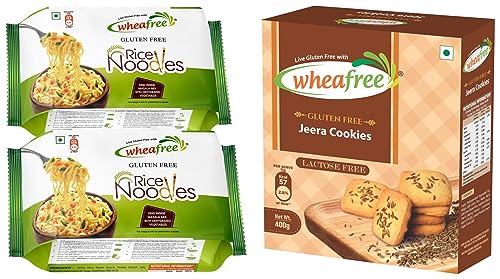 Wheafree Rice Noodles - Pack of 2 (200g each)The product in display is lactose and soy exempt and is made with rice salt potato starch corn starch sago xanthan gum edible vegetable oil. It has a shelf life of 6 months. It comes in a food grade laminated pouch. Keep away from sunlight in a cool dry place. Cooking Directions Quantity- 200gms Serves- 2 Cooking Time- 10 mins - Boil a pot full of water. - Carefully separate the noodle cake into three parts. - Once the water is boiling hot add the noodle cakes into the pot and also add one tbsp of oil to avoid them from sticking together. Now cover the pot with a lid. - Boil the noodles for about 5-7 minutes on high flame and do stir them in between. - Now take off the lid and check your noodles. When you see the noodles floating above the water and on touch they feel slightly undercooked take it off the flame. - Drain the water and rinse the noodles under cold water to remove the starch. Once you are able to see the noodle strands separately stop rinsing it. - Now put the noodles back into the empty pot/ separate bowl and toss them with 1tbsp of oil to prevent clumping. - Heat 1tbsp of oil in a separate pan on medium heat. - Till the time the pan is getting heated up take half a cup of water (175ml) and add to it the Wheafree masala mix that is provided to you in the pack. Now stir the powder thoroughly so that there are no lumps. - Once the pan is heated add the boiled noodles to it followed by the water containing the masala dissolved in it. If you prefer your noodles soupy you can add slightly more water to the pan. - Stir the noodles with a light hand and continue cook it for 2-3 minutes on a medium flame. - Add salt and pepper to taste. - If you like you can add salted/ fresh butter to enhance the flavours. - According to your taste preference you can add to your noodles fresh/ lightly sautéed vegetables and any gluten free sauce that you have.Wheafree Gluten Free Jeera Cookies (400g) | Lactose Free | Crispy & Crunchy | Best Tea Time Snacks | 100% Vegetarian and Wholesome IngredientsWheafree Jeera/Cumin Cookies are a favourite tea time snack which is baked to crunchy perfection. Our gluten free cookies are a crispy in texture and have a delicately balanced flavour. They go perfectly well with your hot tea coffee and you can also snack them while travelling.