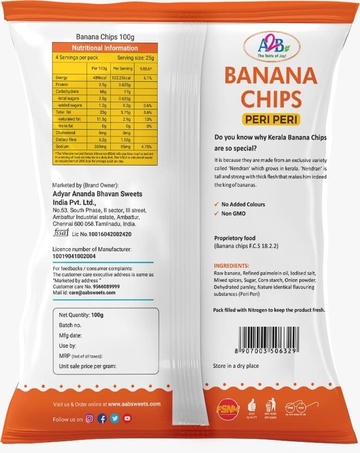 A2B Banana Chips Peri Peri (Pack of 3 * 100 GMS)