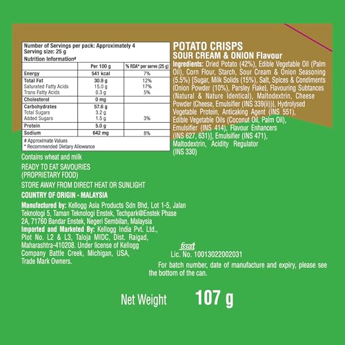 Pringles sour cream and onion flavoured potato chips offer a burst of flavour in every bite with none of the guilt. That is because they have 50 percent fewer calories than regular crisps since they are made with olestra. The pringles potato chips are ideal for snacks or lunch.