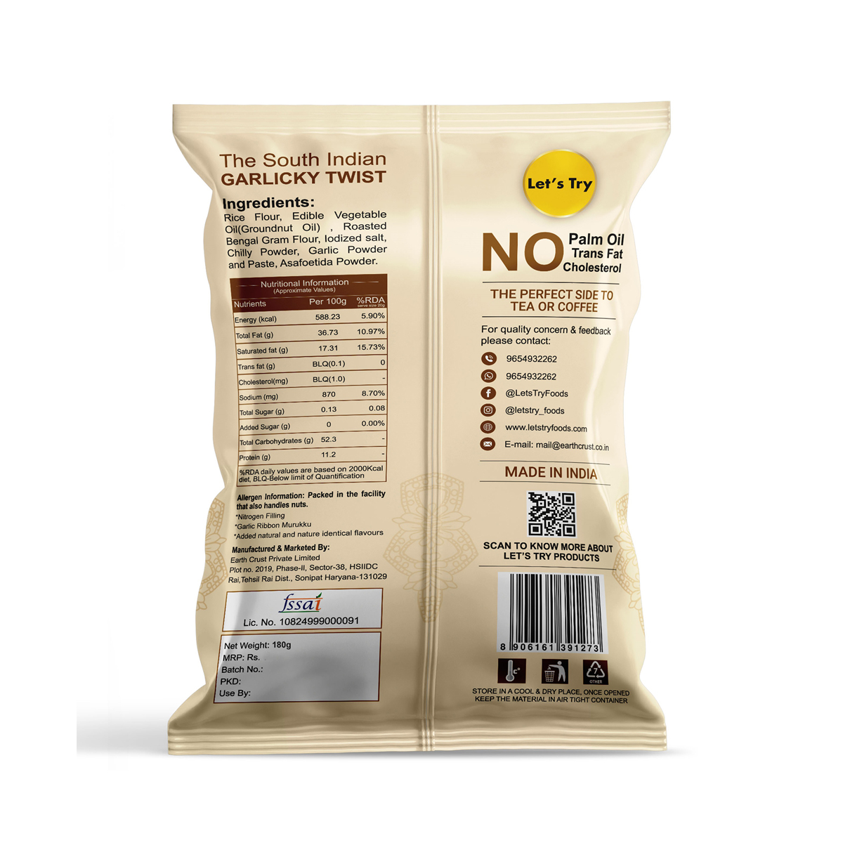 At Lets Try, we believe healthy snacking can be fun too. We follow traditional methods to make all our snacks, just like your grandma used to. We use 100% groundnut oil. No preservatives, No artificial flavors, or colors, no trans fats or cholesterol
