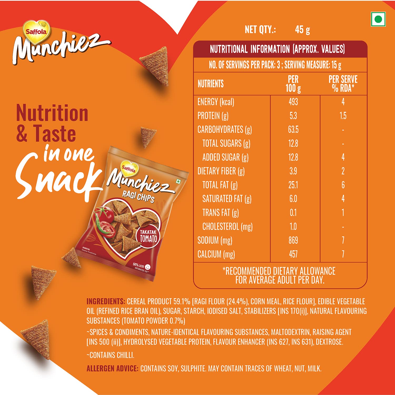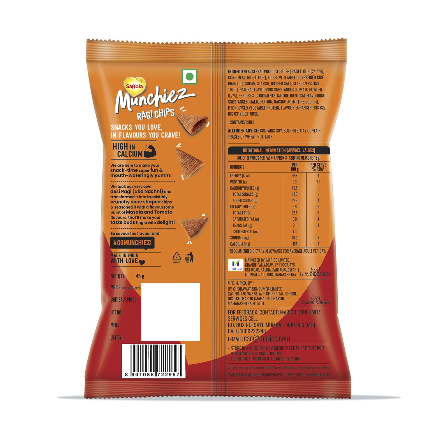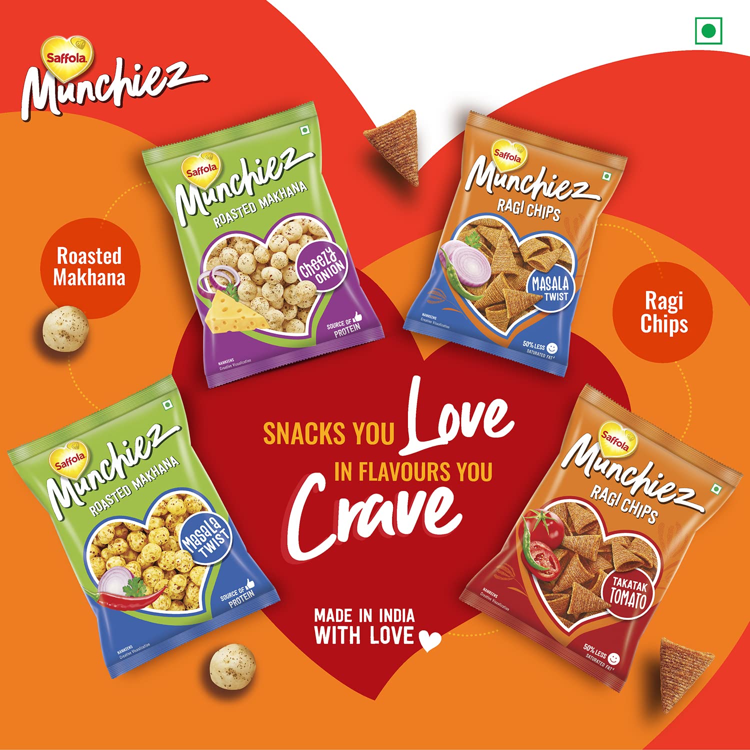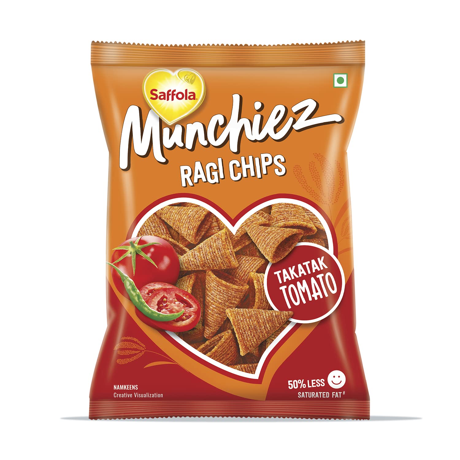 Saffola Munzhiez is a range of tasty and healthy snacks that you love in flavours that you crave. Whether you need a quick hunger fix in between your meals or want something to accompany your late-night binge of your favourite series or want to share snacks during your hang out with friends Saffola Munchiez is the perfect partner for all such occasions. The Ragi Chips range of products have been made with Ragi - the king of all grains. It is a 4000-year-old indigenous grain that is high on nutrition needs minimum fertilisers to grow and uses very little water. It is thus good for the consumer the farmer and mother nature. We retained the benefits of Ragi and converted it into unique cone shaped chips and seasoned them with mouth-watering masala and tomato flavours. Saffola Munchiez Ragi Chips contains 50% less saturated fat as compared to other fried potato chips in the market. It is also high in calcium and a source of fiber. Try out our other product range of Saffola Munchiez Roasted Makhana also and dive into a mouth wateringly delightful snack-time!! Let's go munching with Saffola Munchiez!