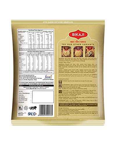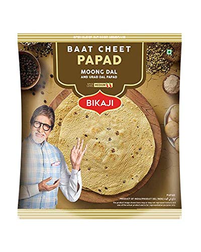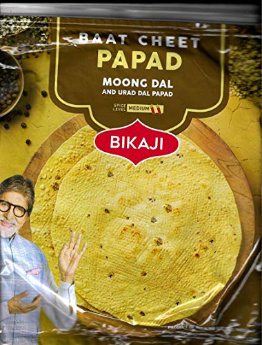 Bikaji Baat cheet papad bikaneri mix moong urad dal papad [Handmade medium Spicy & Rajasthani flavor] Special flavoured Black Pepper [Kaali Mirch] & Asafoetida [Hing] -bikaji moong dal papad rajasthani big size - moong dal papad bikaneri . - papad namkeen . This is non spicy papad . This is papad bikaner or bikaneri papad or papad bikaneri moong . this is moong dal papad rajasthani . This is bikaneri papad moong dal made from Spilt Moong (lentil) Flour (25.7%). This is bikaneri moong dal papad rajasthani made with hygiene. This is a Vegetarian product. National brand It is a papad Suitable for all food Country of Origin: India/ pack of 1 pcsProduct Des BIKAJI Moong Dal Papad medium spicy /baat cheet papad (spicy) 400 grm (pack of 1) store mrp apply on product While we work to ensure that product information is correct on occasion manufacturers may alter their ingredient lists. Actual product packaging and materials may contain more and/or different information than that shown on our web site. We recommend that you do not solely rely on the information presented and that you always read labels warnings and directions before using or consuming a product. For additional information about a product