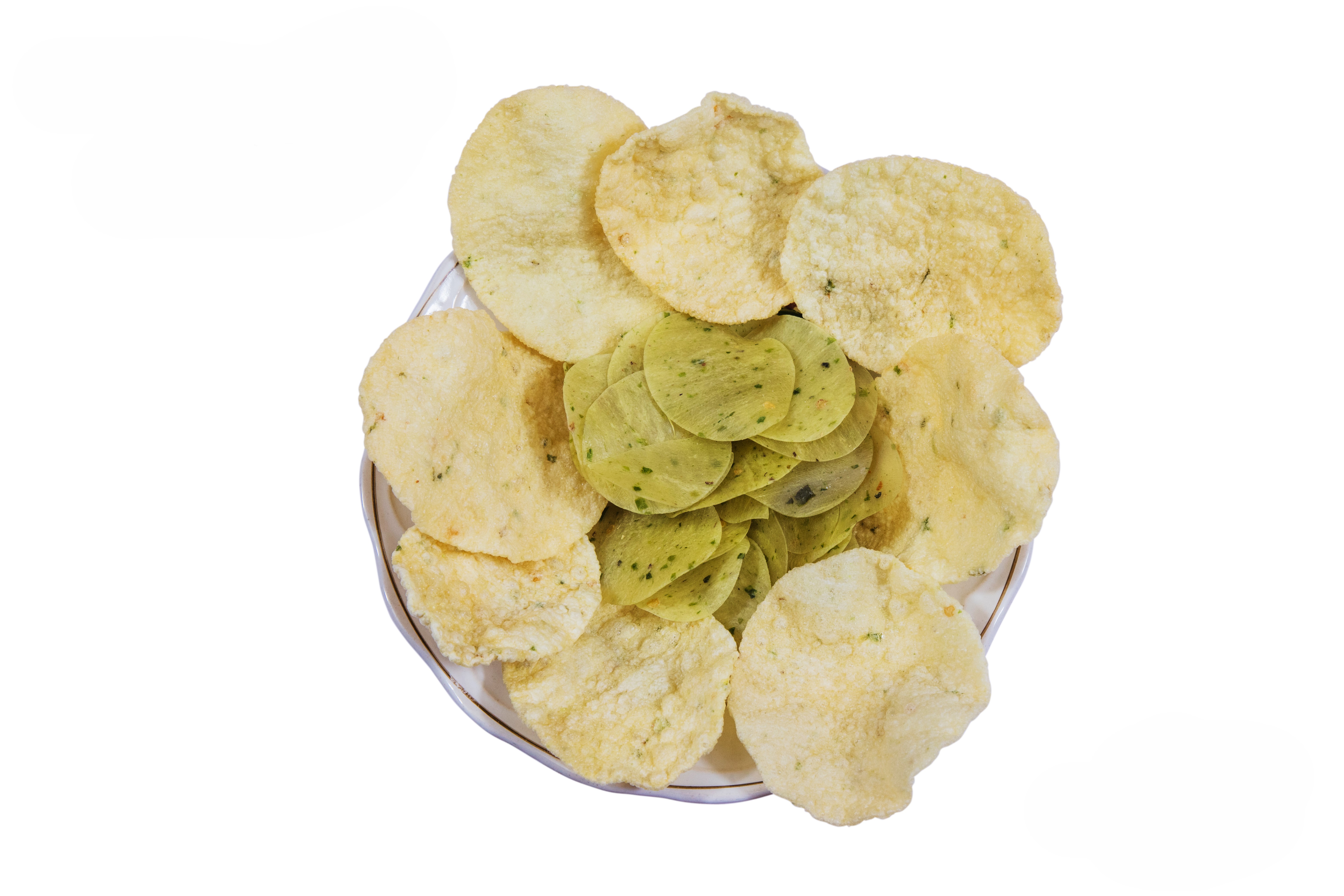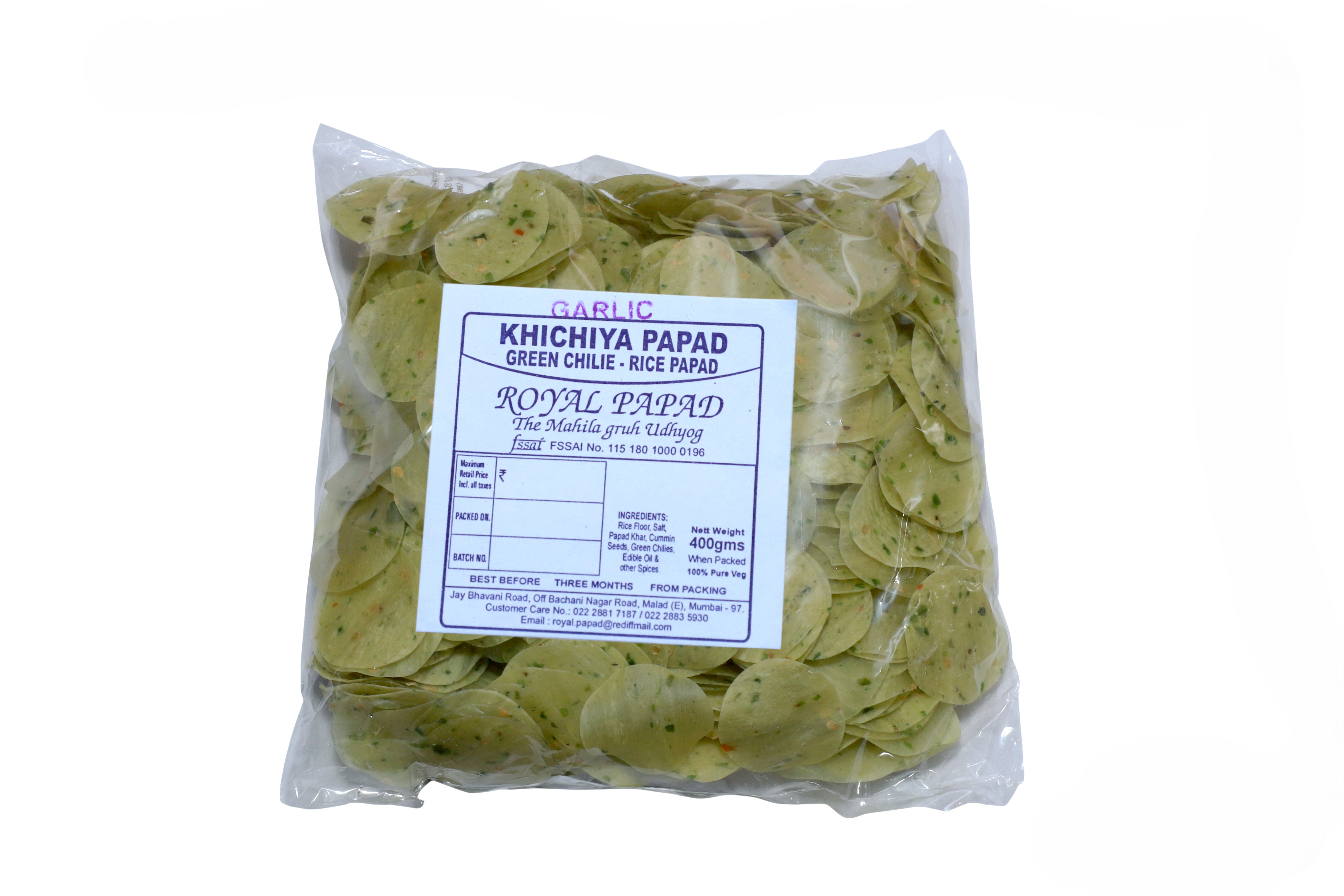A RICE LIKE PAPAD WHICH IS SMALL LIKE CHIPS HAVING CUMIN SEEDS MADE FOR SNACKS BUT HAS GARLIC AND GREEN CHILLY WHICH MAKES TASTY SPICY.