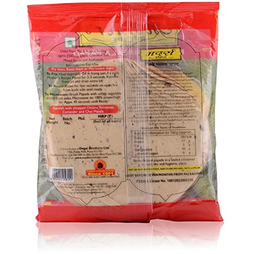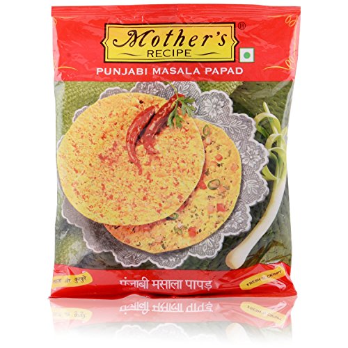 Mother's Receipe Papad Punjabi Masala. Mother Recipe Punjabi Masala Papad 200gms (Lentil crisp seasoned with black pepper spices & salt authentic traditional recipe) A Punjabi speciality & a papad full of peppery zest it is a true treat for all lovers of spice. Best enjoyed with a garnish of tomatoes onions coriander & chaat masala Enjoy with-This papad is ideal to be consumed as a snack with dips or as an accompaniment with your meals or can be served with a minty pea dip