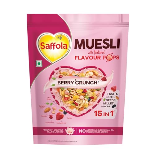 The right start can make all the difference to your day â that's where Saffola Muesli Berry Crunch with Flavour pops steps in offering a delightful blend of flavours and nutrients to kickstart your day. This Berry Crunch Muesli will give you the delicious burst of Berry flavour and crunch with the unique flavour pops! A blend of millets seeds fruits and nuts makes this a powerhouse breakfast cereal and is a breakfast of champions that is as nourishing as it is delicious! To top it off it has the crunchy Flavour Pops that add a burst of crunch & flavour starting your day on a happy note. NO but it's not just about taste â our Muesli is a treasure trove of dietary fibre and essential proteins. It's free from any unwanted additives like Maida Palm oil or Artificial Flavours & Colours. It has 15 in 1 Fruit and Nuts Seeds Millet & more to give you the nutrient rich breakfast. There are a variety of available Cereals for breakfast what makes Muesli stand out is that it is rich in wholegrain protein fibre and to top it off it is yummy! Saffola Muesli with Natural Flavour Pops makes your breakfast very exciting making your day start on a happy note! Every bite is a delicious burst of rich flavour and irresistible crunch that will instantly cheer you up. Indulge in the delicious goodness of Berry Crunch. Fill your day with Joy!