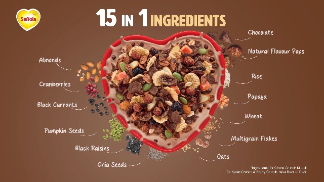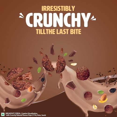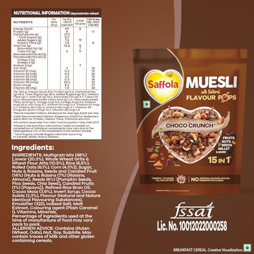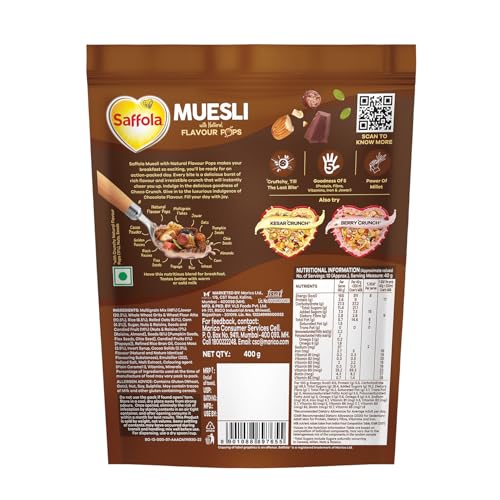 The right start can make all the difference to your day â that's where Saffola Muesli Choco Crunch with Flavour pops steps in offering a delightful blend of flavours and nutrients to kickstart your day. This Choco Crunch Muesli will give you the delicious chocolaty burst of flavour and crunch with the unique flavour pops! A blend of millet seeds fruits and nuts makes this a powerhouse breakfast cereal and is a breakfast of champions that is as nourishing as it is delicious! To top it off it has the crunchy Flavour Pops that add a burst of crunch & flavour starting your day on a happy note. NO but it's not just about taste â our Muesli is a treasure trove of dietary fibre proteins & essential vitamins. It's free from any unwanted nasties like Maida Palm oil Artificial Flavours or Artificial Colours. It has 15 in 1 Fruit and Nuts Seeds Millet & more to give you the nutrient rich breakfast. There are a variety of available Cereals for breakfast what makes Muesli stand out is that it has the goodness of wholegrain protein fibre and to top it off it is yummy! Saffola Muesli with Natural Flavour Pops makes your breakfast very exciting making your day start on a happy note! Every bite is a delicious burst of rich flavour and irresistible crunch that will instantly cheer you up. Indulge in the delicious goodness of Choco Crunch. Fill your day with Joy!