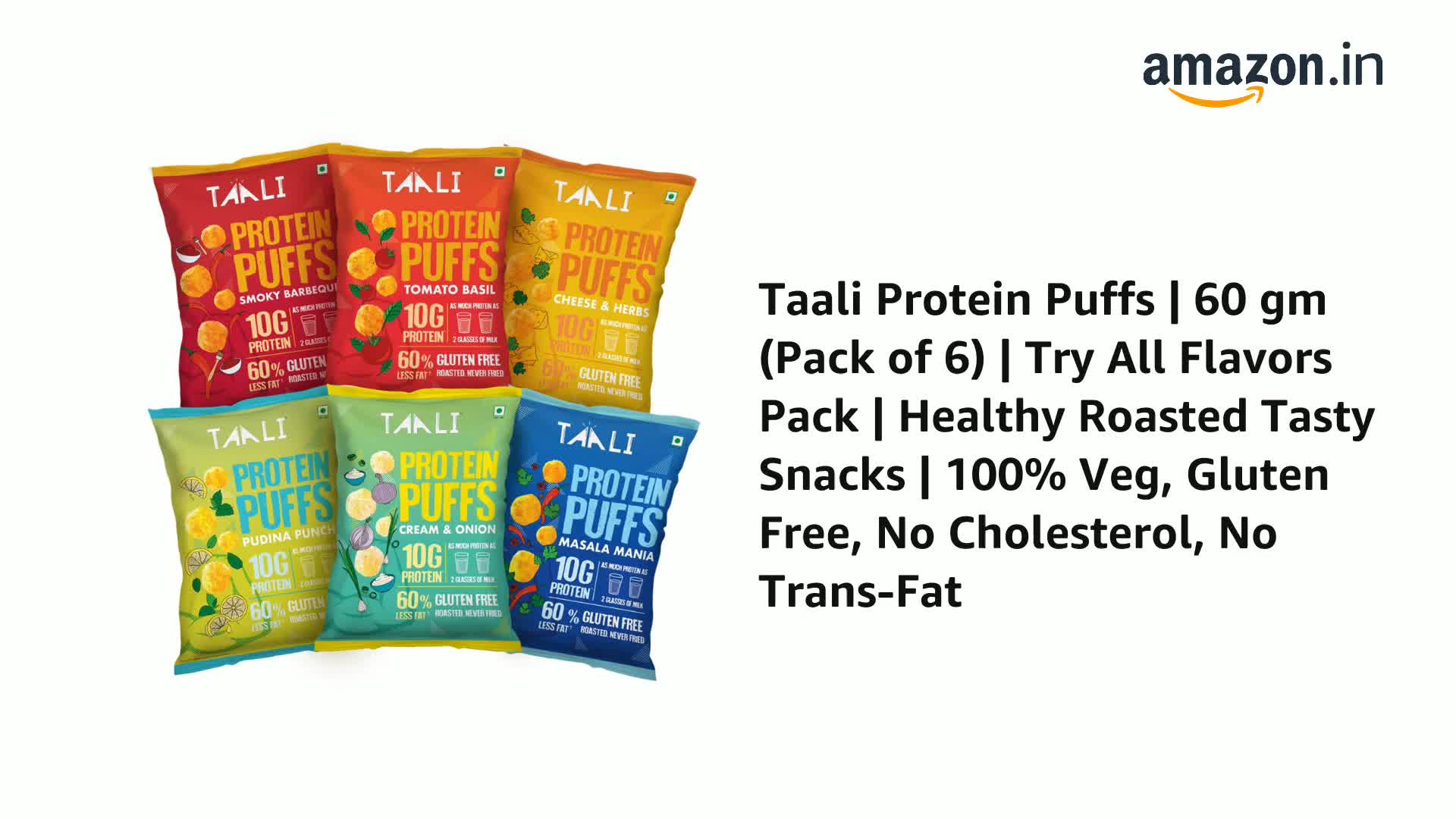 Taali Protein Puffs | 60 gm (Pack of 6) | Try All Flavors Pack | Healthy Roasted Tasty Snacks | 100% Veg Gluten Free No Cholesterol No Trans-Fat