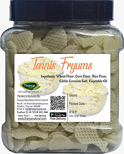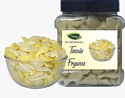 Fryums are ready to fry papads that come in various fun shapes and sizes - round ring star pipe triangle wheel long flat or 3D which make them specially appealing to kids. These healthy snack foods made of flour and potato/corn/tapioca starch are a great alternative to chips. The tasty and crunchy fryums can be served as an evening munch just like any other namkeen as fresh salty snack with tea coffee or any other beverages. along side meals as pappadam or binge eating while work. Flat looking Tennis Bat fryums (also known as crunchy Tennis Bat papad) puff up into crunchy 3D Tennis Bat shaped papads instant snacks that can be served fresh whenever you want. You can also Air Fry or Microwave them. How to Fry Thanjai Natural Tennis Bat papad: 1. Heat the oil to high temperature (approx 185 - 195 degree Celsius). Avoid smoking or burning of the oil. 2. To check if the oil is heated enough drop a small piece of fryum in the oil and it should puff up and rise to the surface 3. Switch the heat to somewhere between medium and high 5. Slide or Drop the fryums carefully into the oil 6. As they puff and rise to the surface take them out with slotted spoon shaking off the oil. 7. Place them on paper towel to remove excess oil before serving. 8. Sprinkle chat masala to taste. Storage Instructions: Always store fryums in air tight containers in cool dry place away from moisture or direct sunlight. Ingredients: Refined Wheat Flour Whole Wheat Flour Rice Flour Tapioca Starch Iodized Salt Corn Flour Corn Starch Sugar & Refined Palm Oil.