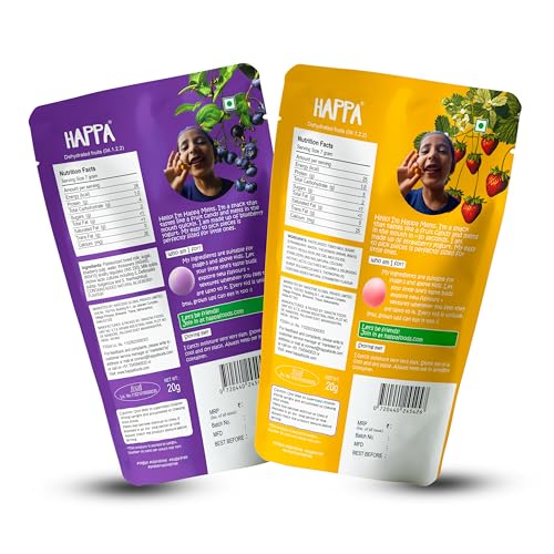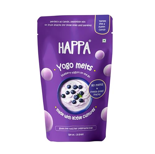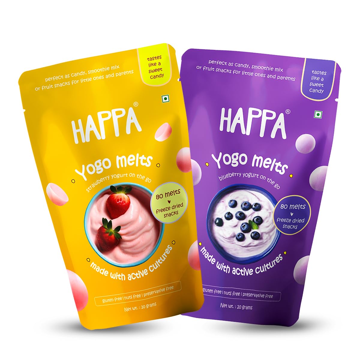Happa Fruit Melts : 100% only fruit no other additive Happa Yogos: Tiny bursts of goodness! Crafted from wholesome yogurt and fruit Happa Yogos are specially designed yogurt drops that effortlessly melt in your mouth. These delightful treats offer babies and toddlers a delicious and wholesome snack that you can truly feel good about.