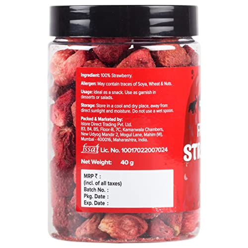 Freeze Dried Whole Strawberry 40g / 1.4oz [All natural Premium Quality Delicious]Soft freeze-dried straware healthy and delicious.We do not any sweeteners or . Just the naturally sweet taste of fresh straw.Serve as a Snack fruit cereal whip up smoothie sprinkle over the salad topg for yogurt or ice cream.Can be consumed by everyone a great and healthy snack. It is a tasty delight to enjoy during free hours or to taste for refreshment.