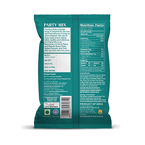 Cornitos party mix is an assortment of hot & spicy & wasabi green peas salted peanuts and corn nut that can kick start any party. Wasabi green peas salted peanuts and corn nut are a great source of protein fibre containing nutrients and essential minerals. Party mix is cholesterol free snack ideal for house party travel time munching snacking in office and even post-workout snacking. 200g resalable pack of party mix has a functional design giving consumers advantage of multiple time product use instead of one-time snacking.