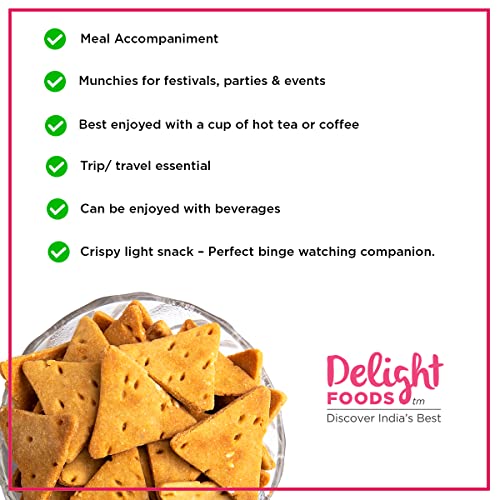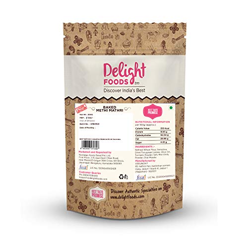 Try our delicious baked Methi Mathri (Mathi) a healthy alternative to the traditional deep fried Mathri without compromising on the taste. Traditional marwari recipe and only premium ingredients are used to bake these crispy fun shaped healthy snack. Savor the mint masala flavor from real Fenugreek leaves a perfect snack for your tea time. Our healthy range of snacks are made of 100% natural ingredients and contains no artificial flavors or preservatives. Popular mass brands use the harmful palm/ cottonseed oil or vegetable fat to increase shelf-life and reduce cost. However our baked/roasted snacks contains just a touch of olive oil or pure desi ghee making it an ideal guilt-free snacking choice for you and your loved ones. Each pack is carefully packed in a hygienic facility with lots of love and care.