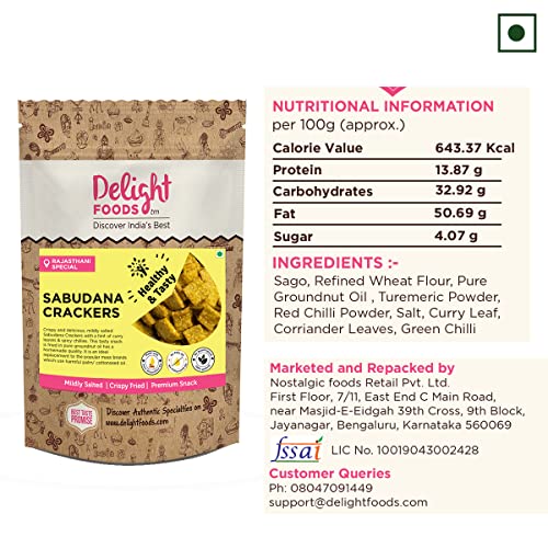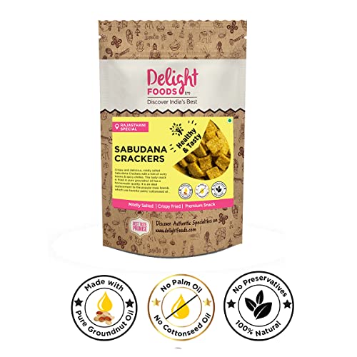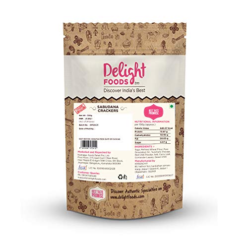 Sabudana Crackers is a bite-sized crispy delight prepared using tapioca pearls and Pure Groundnut (Peanut) Oil. This delectable masala flavoured snack is the perfect accompaniment with a cup of tea/ coffee and also a quick fix for your hunger pangs. Fried in fresh groundnut oil our sabudana crackers are a notch above the mass brands that use harmful palm/ cottonseed oil & vegetable fat. Apart from which groundnut oil enhances the flavour of sabudana and is also a good source of essential unsaturated fats. Our snack packs contain delicious munchies lots of love a bit of nostalgia and nothing else; No preservatives or chemicals are used in our snacks to ensure you can enjoy snacking without the fear of ingesting harmful additives. Prepared packed & processed in a very hygienic facility. Mildly salted & seasoned with a blend of traditional spices each bite of this super delicious cracker packs a crunch along with yummy notes of coriander & curry leaves.