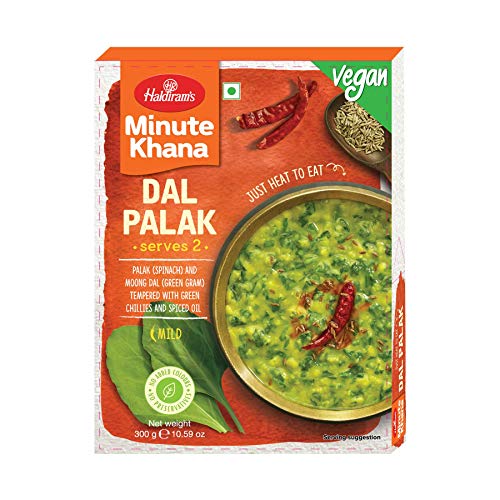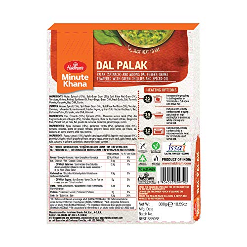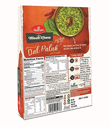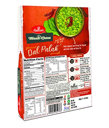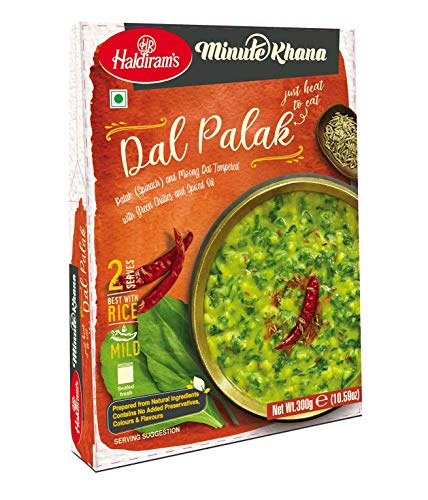 Haldiram's ready to Eat Dal Palak is a preparation of WaterSpinish Split Green GramSplit Pulse GramFresh GarlicSalt with cooked with fresh herbs sun dried spices and butter for a smooth texture finish. Blended in onion tomato and tempered with a sprinkling of green chillies We used Gruner chilli for the authentic taste and flavour.