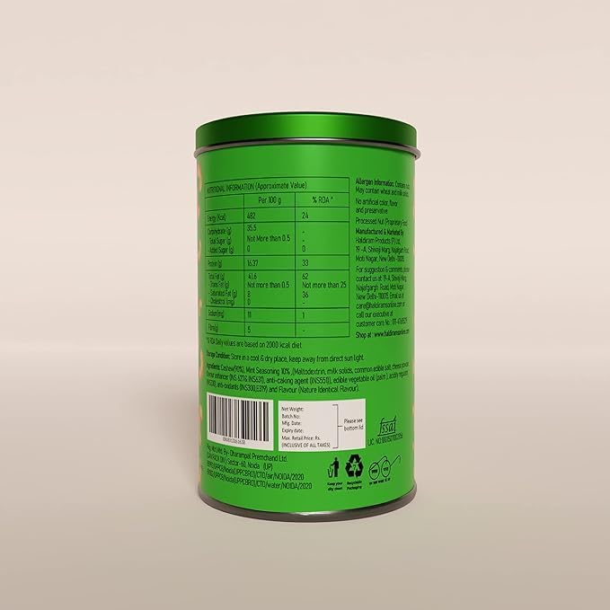 Haldiram's Premium Pudina Cashews Freshly ground Mint Leaves and rock salt. These are the best nuts you can ever find. They are delightfully rich and tasty a nutritious treat that will make a great snack time.