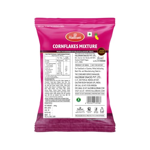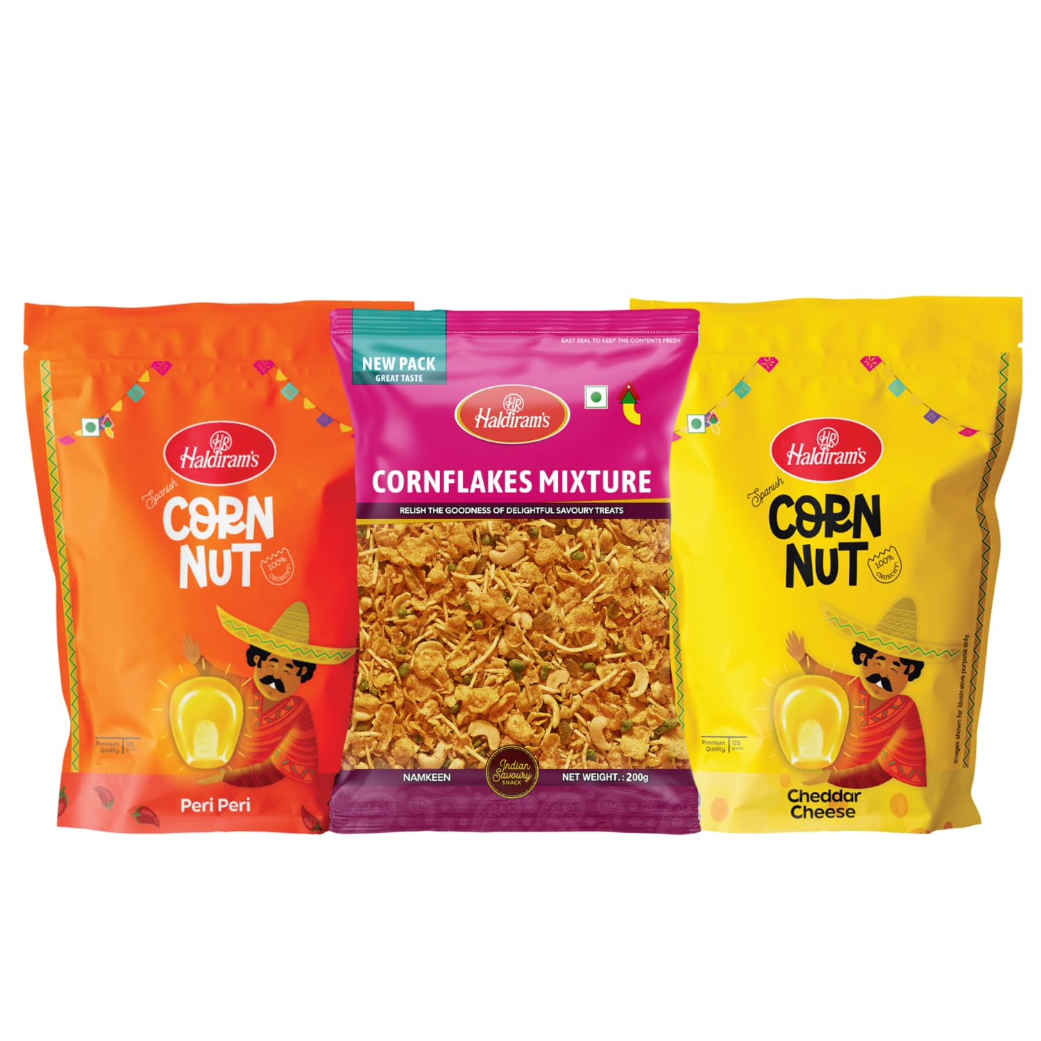 Haldiram's Cornflakes Mixture & Roasted Corns Combo offers a unique blend of crispy toasted cornflakes a variety of roasted nuts and flavorful seasonings. The cornflakes are light and crunchy creating the perfect base for this savory mix. Coupled with a selection of premium roasted nuts including peanuts cashews and almonds the snack delivers a satisfying texture and rich flavor. The carefully crafted spice mix adds the perfect balance of sweetness heat and savory notes.