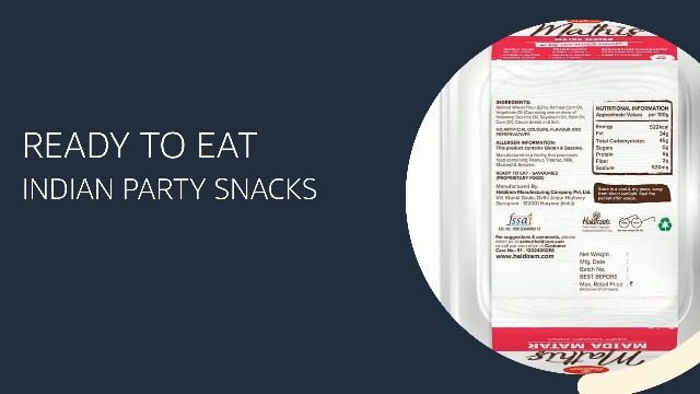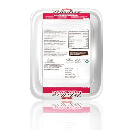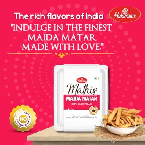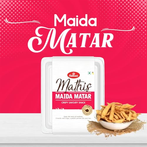 Haldiram's Maida Matar is a savory snack that combines the rich flavors of wheat flour and a blend of spices. The snack is made from a dough prepared with wheat flour which is then shaped into salty diamond cuts and deepfried until they become crispy and golden.