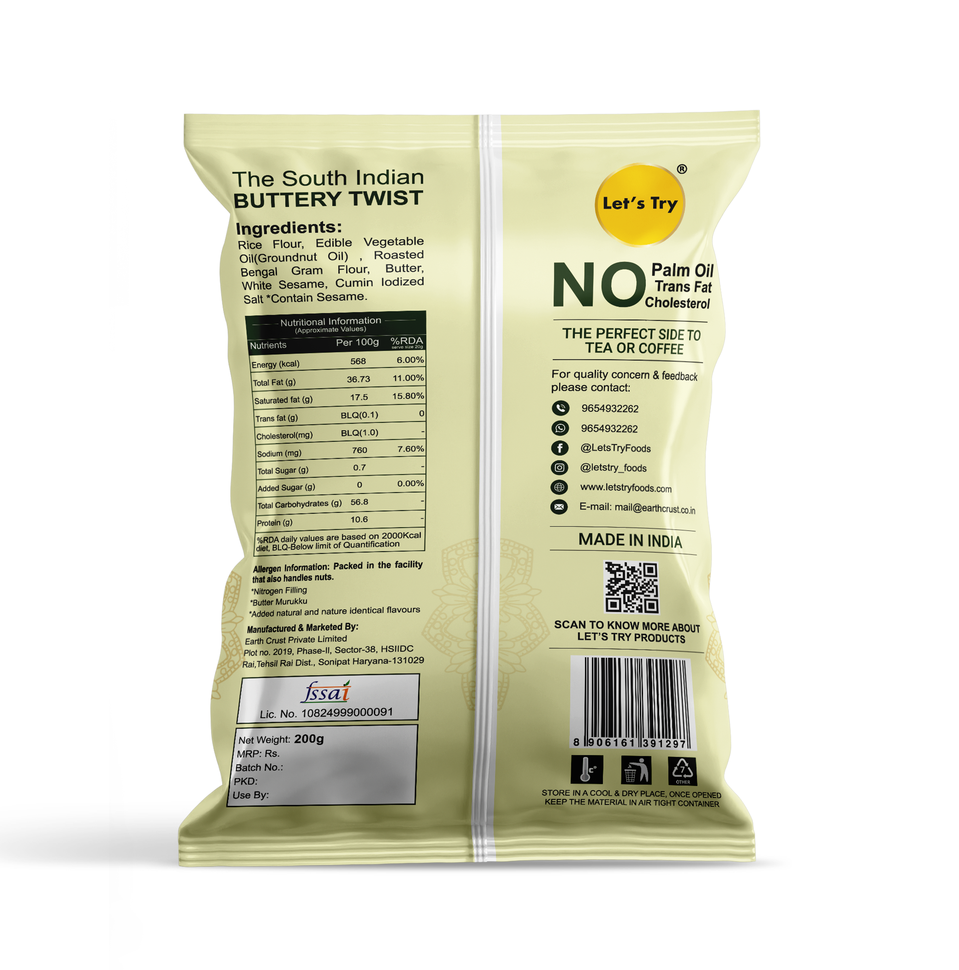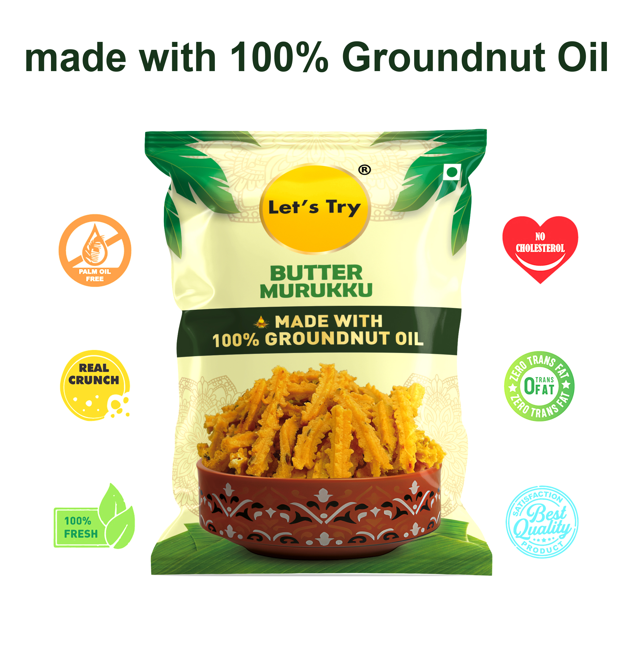 At Lets Try, we believe healthy snacking can be fun too. We follow traditional methods to make all our snacks, just like your grandma used to. We use 100% groundnut oil. No preservatives, No artificial flavors, or colors, no trans fats or cholesterol
