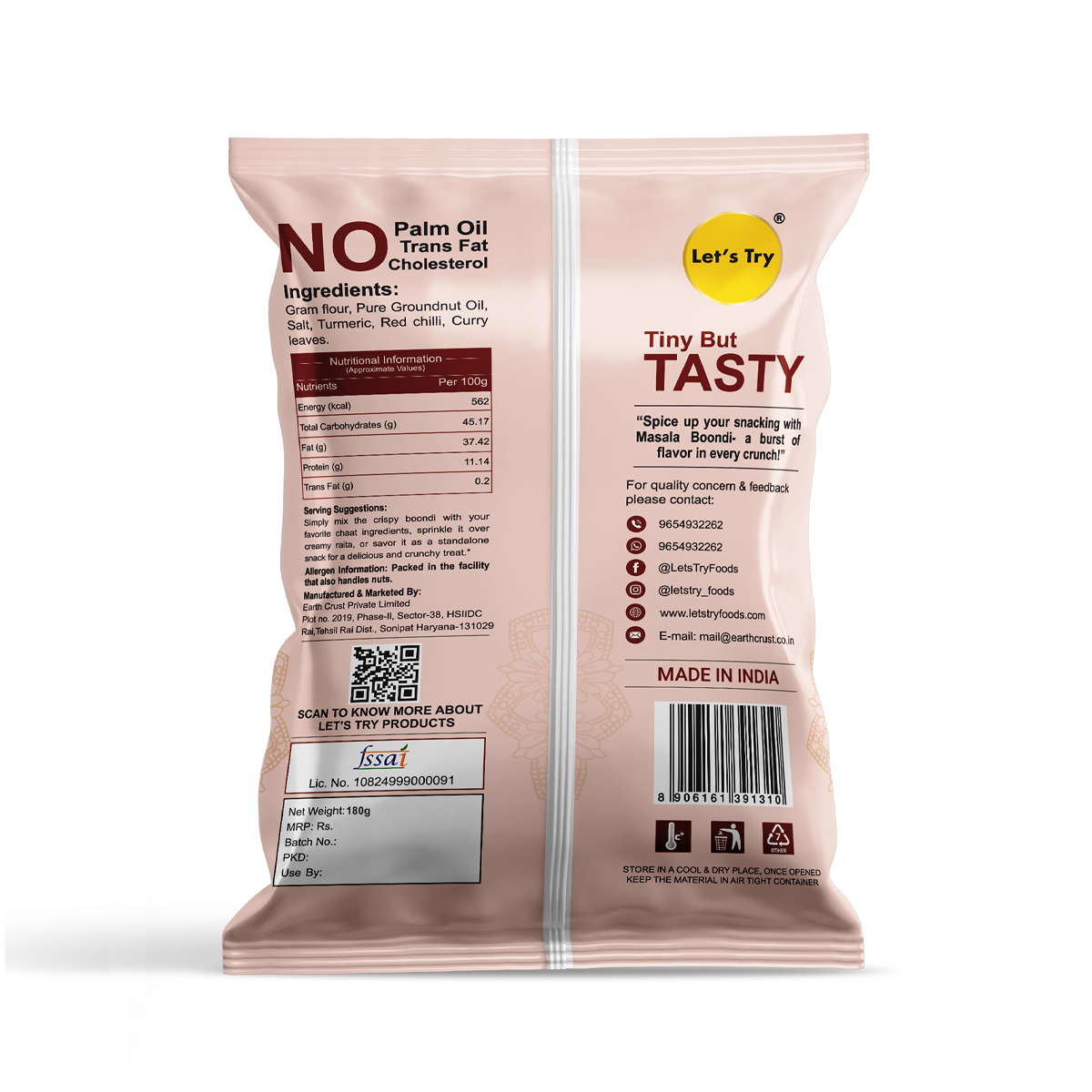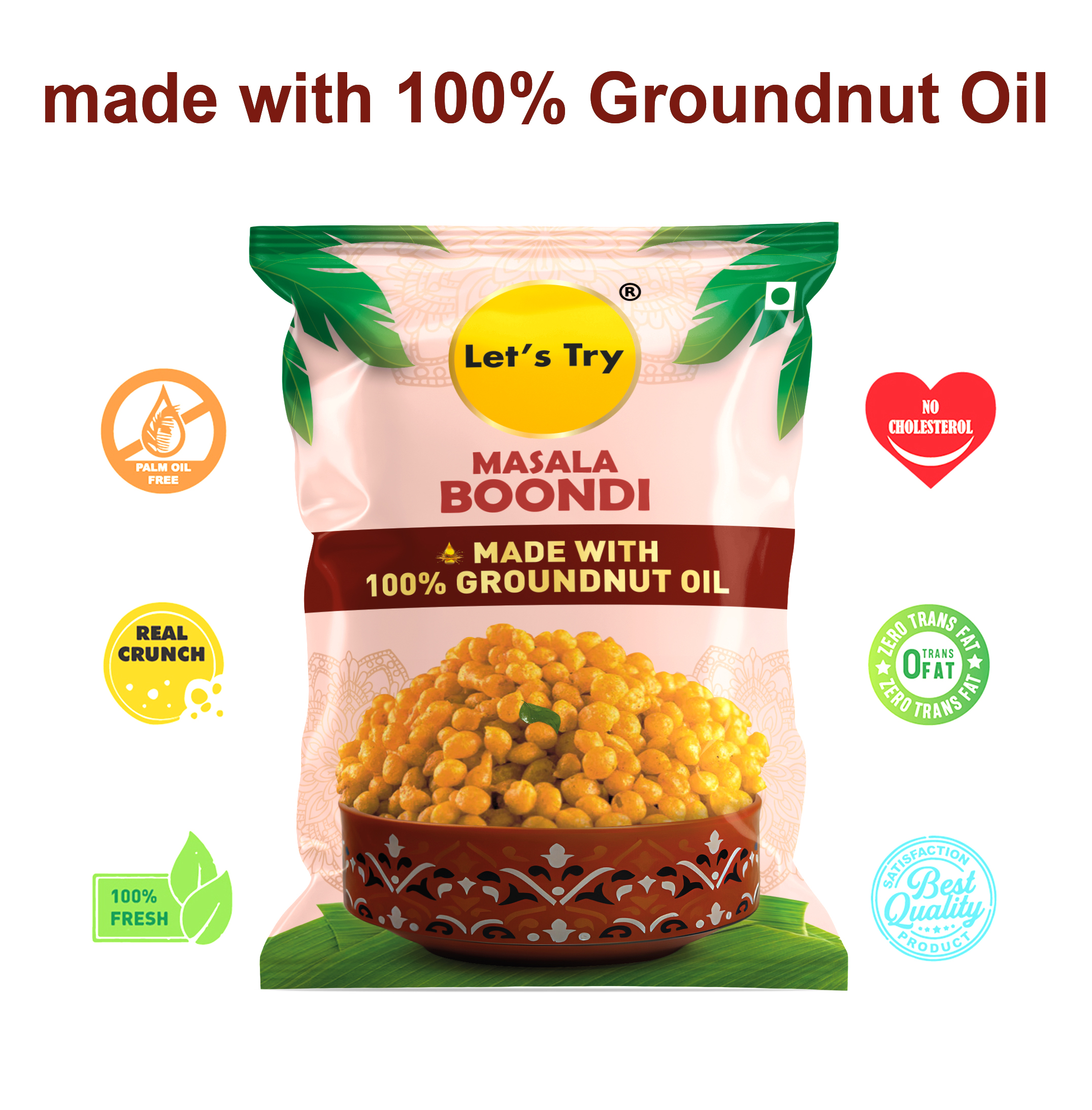 At LetÕs Try, we believe healthy snacking can be fun too. We follow traditional methods to make all our snacks, just like your grandma used to. We use 100% groundnut oil. No preservatives, No artificial flavors, or colors, no trans fats or cholesterol