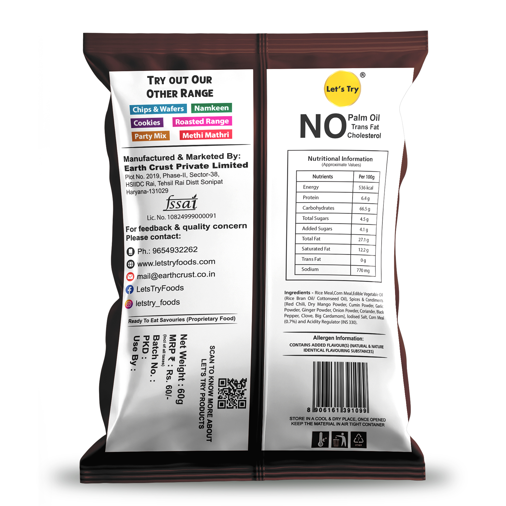 At Lets Try, we believe healthy snacking can be fun too. We follow traditional methods to make all our snacks, just like your grandma used to. We use 100% groundnut oil. No preservatives, No artificial flavors, or colors, no trans fats or cholesterol
