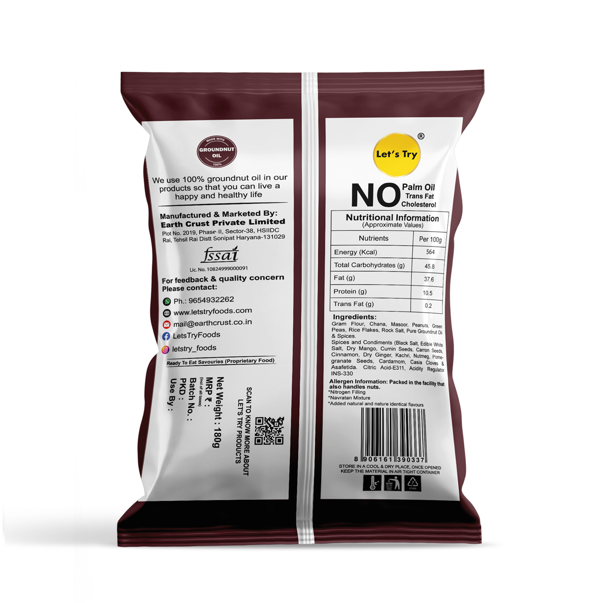At Lets Try, we believe healthy snacking can be fun too. We follow traditional methods to make all our snacks, just like your grandma used to. We use 100% groundnut oil. No preservatives, No artificial flavors, or colors, no trans fats or cholesterol