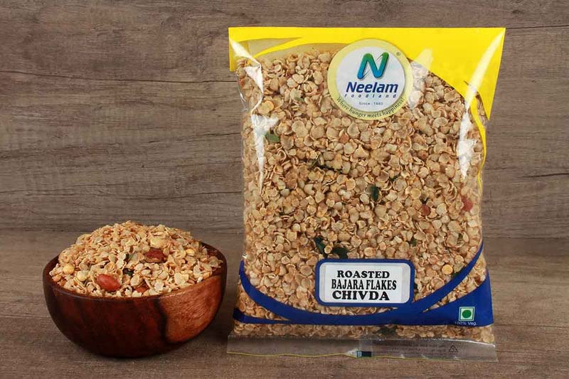 Neelam Foodland Roasted Bajra Flakes Chivda: "Chivda"- Beaten Bajra flakes is a very common snack in parts of India. Crisp & Delicious Flat Bajra chivda blended with Bajra flakes. A perfect snack that can be enjoyed anytime anywhere A healthier and calorie-consious alternative to deep-fried snacks. It can be enjoyed plain or Garnish it with various dressings for an added taste. One can also take along a snack box filled with Chivda to school or office for easy snacking. It will be a good combination with juice or milk shakes. Tea-time is never complete without dry snacks. Enjoy them in your next party.