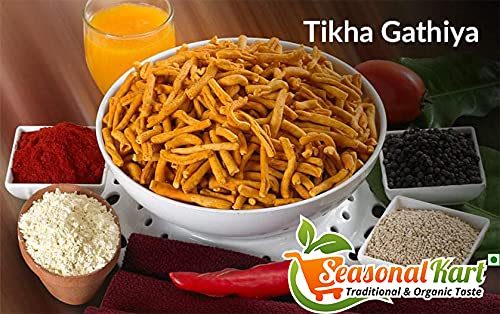 Seasonal Kart Tikha Gathiya Namkeen Indian Snack| Homemade & Pure Tikha Gathiya|Chemical Free| Spicy Healthy Indian Snacks | No Added Preservatives|About Us:We believe that our reputation must be based on the quality of our products. We have traveled across the country to handpick the finest quality products at the best possible rates. We maintain great taste and guaranteed quality throughout the year and our products are sure to be your new favorites after your first purchase.About Product:Seasonal Kart Special Rajasthani Khokha Sev | Jadi Sev | Ganthiya/Gathiya | Spicy Sticks | Tikha Gathiya Namkeen Indian Snack. Crispy and tasty Gathiya with a pleasing taste!. Pop a spoonful into your mouth and savor the crunchiness of this delectable snack! A perfect snack that can be enjoyed anytime anywhere. While it is perfect to have on a cold rainy day with a cup of chai this versatile snack is also light enough to enjoy on a hot summer's day with a glass of juice or to take along to school or the office in a snack box!Ingredients:Gram Flour Edible Oil Ajwain Chilli Powder Garam Masala and SpicesCountry of Origin: IndiaSeasonal Kart: Traditional & Organic Taste