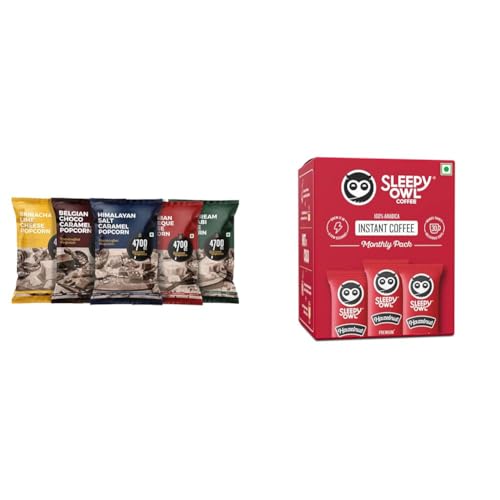 4700BC Gourmet Popcorn Combo Pack Pouch 475g (5 Flavours: 1 Himalayan Salt Caramel 1 Hawaiian Barbeque Cheese 1 Sriracha Lime Cheese 1 Belgian Choco Caramel and 1 Sour Cream and Wasabi Cheese)Indulge in 4700BC Gourmet Popcorn coated in 5 different signature flavours:Himalayan Salt Caramel Hawaiian Barbeque Cheese Sriracha Lime Cheese Orange Chilli Caramel and Sour Cream and Wasabi Cheese.A combo pack filled with exquisite variety of flavours to satisfy every taste bud!Sleepy Owl Hazelnut Flavour 100% Arabica Coffee Sachets | 60g - Pack of 30 x 2g Instant Coffee Powder Sachets | Nutty & Bold | Travel FriendlyYour days are set to brighten up with Sleepy Owl’s Hazelnut Pack of 30 Premium Instant Coffee Sachets. We are here to give you the best flavours and an ultimate experience that will make you devour every sip of our coffee. Experiment with our coffee and make recipes as per your taste. It’s that easy. Have it hot or cold enjoy it as black coffee or blend it into a frothy & pillowy cold coffee. There are many ways to enjoy our best instant coffee’s genuine aroma and rich taste. The tasting notes of our coffee will woo your mind. There are absolutely no additives or substitutes all you get is supremely premium coffee. Our 100% Arabica coffee comes from the best farms across India and is roasted with utmost care. You get the perfect notes that are rich and wholesome. All you need is hot milk or water and you can make up to 30 cups with our sachet pack. The shelf life of our coffee is up to 547 days. With Hazelnut Premium Instant Coffee Sachets let the coffee mist take all over your house.