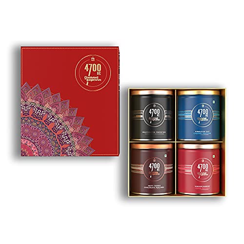 4700BC Gourmet Popcorn: Tiramisu Chocolate Tin 125/135gIndulge in 4700BC Gourmet Popcorn balanced beautifully with tiramisu chocolate. Packed in an exquisite contemporary and extremely durable tin that can be reused for endless purposes. An enjoyable snack with rich flavour for all chocolate lovers!4700BC Gourmet Popcorn Festive Gift Box 440g (4 Tins: 1 Hawaiian Barbeque Cheese 1 Himalayan Salt Caramel 1 Nutty Tuxedo Chocolate and 1 Mocha Walnut Chocolate)A perfect gift for any occasion with the premium Quality set of 4 Popcorns Contains 1 Hawaiian BBQ Cheese Popcorn 1 Himalayan Salt Country Caramel Popcorn 1 Nutty Tuxedo Chocolate Popcorn 1 Mocha Walnut Chocolate Popcorn