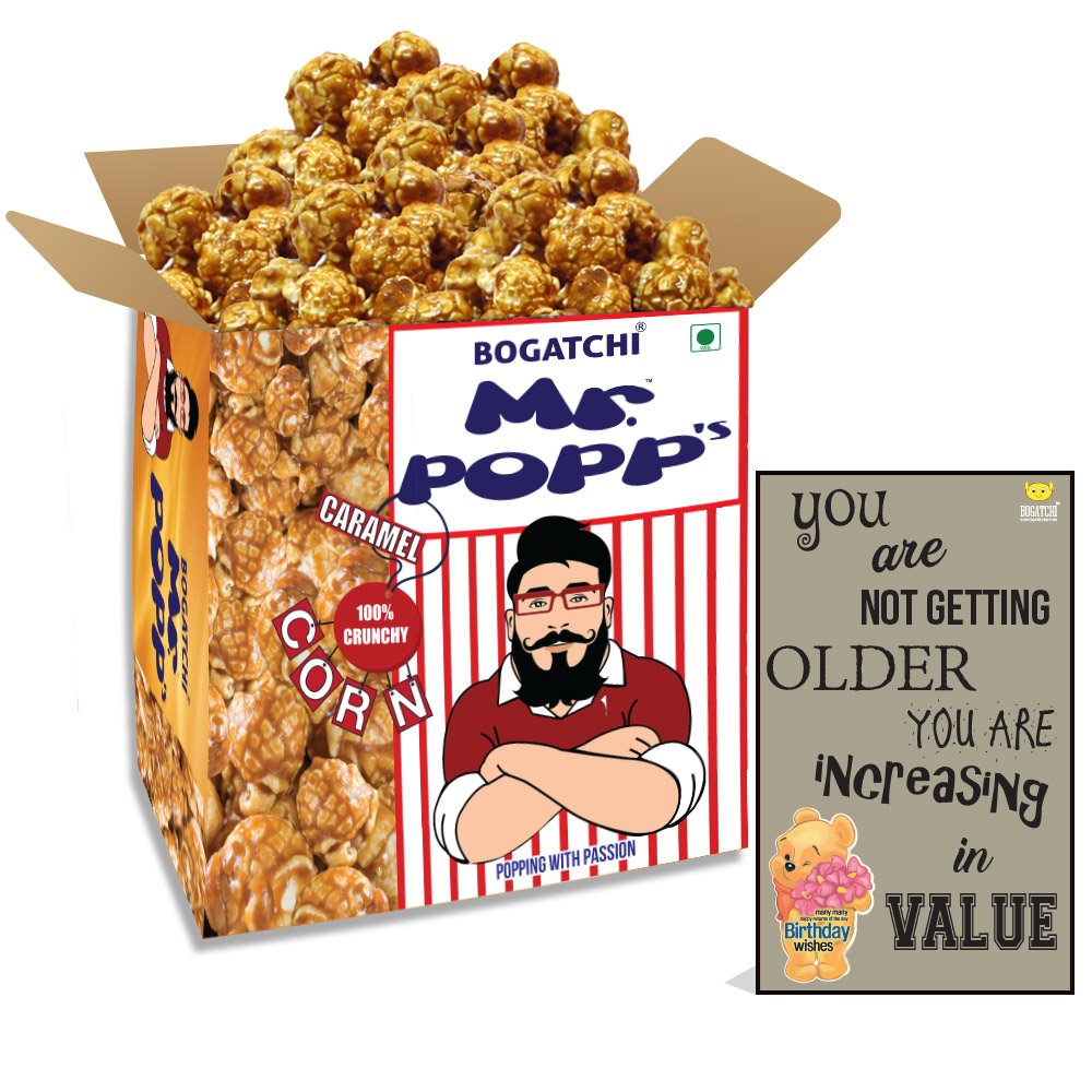 BOGATCHI Mr.POPP's Caramel Popcorn 100% Crunchy Handcrafted Gourmet Popcorn Best Birthday Gift for Mother 375g + Free Happy Birthday Greeting Card