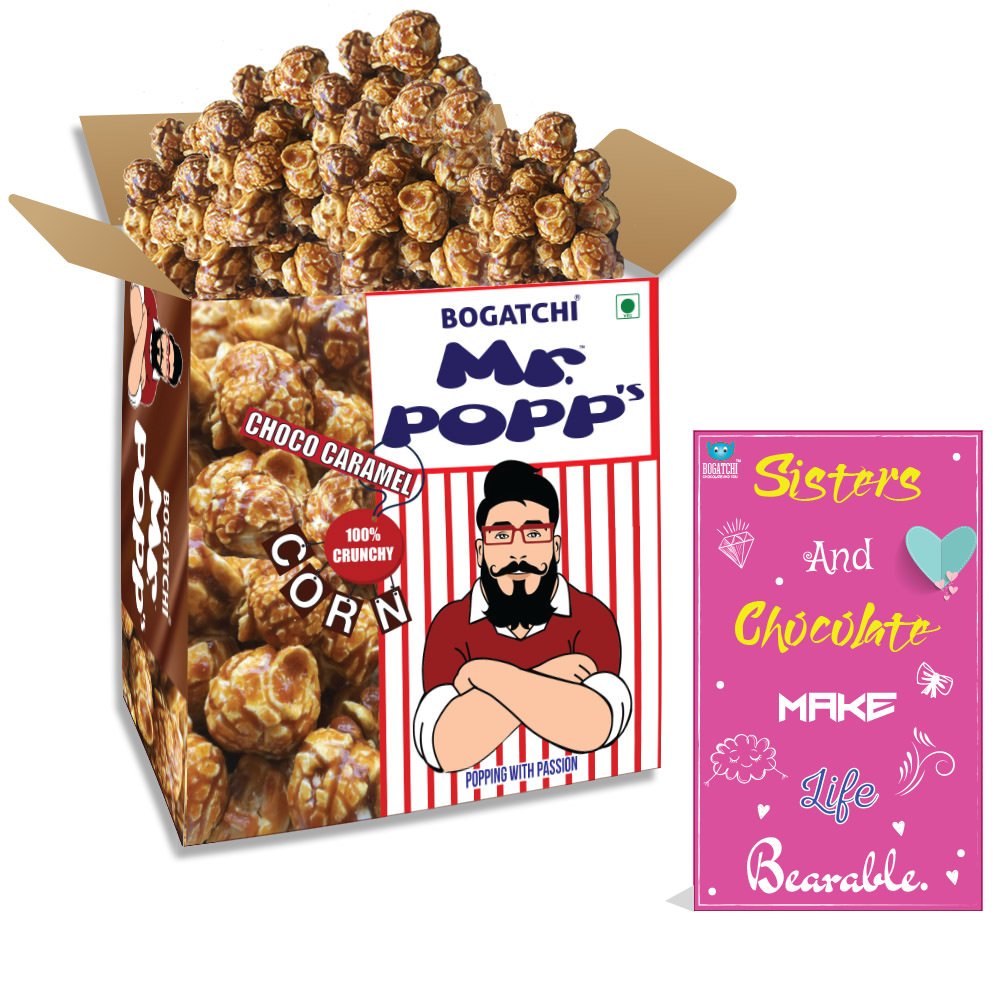 BOGATCHI Mr.POPP's Dark Chocolate Popcorn Perfect Rakhi Gift Handcrafted Gourmet Popcorn Gift Hamper 375g + Free Happy Rakhi Greeting Card