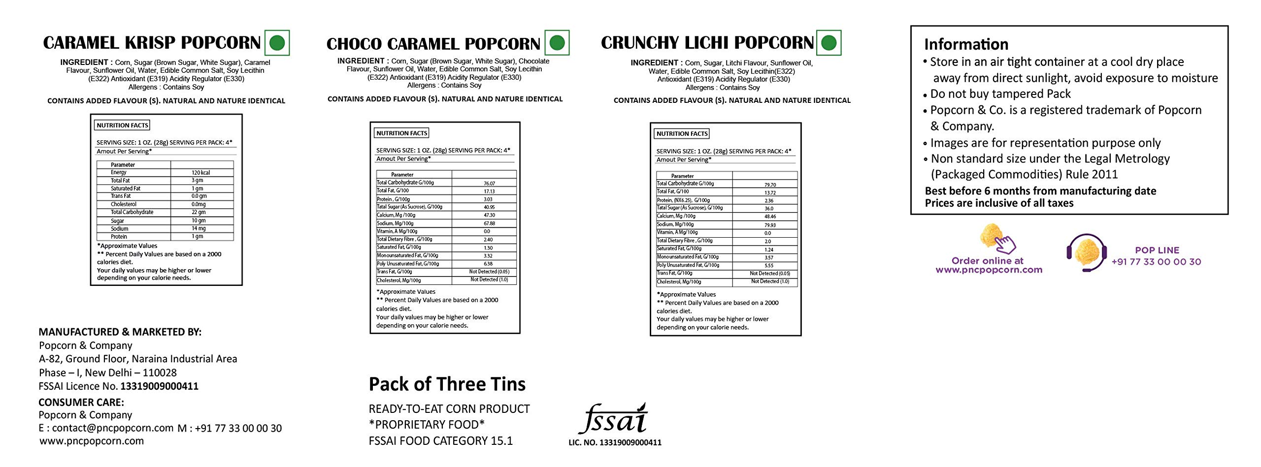 Popcorn & Co 100% Whole Grain Caramel Krisp Popcorn Crunchy Lichi Popcorn & Choco Caramel PopcornFlavoured Popcorn Gourmet Popcorn Ready to Eat Popcorn Regular Tin (390 Grm Pack of 3).Caramel Krisp Popcorn Crunchy Lichi Popcorn & Choco Caramel Popcorn Regular Tin (Pack of 3) 390 GM 1. Freshly handmade in small batches. 2. Raw kernels sourced from world’s best corn kernel fields. 3. 100% whole grain Gluten free made with Non-GMO popcorn kernel. 4. Perfect anytime snack; pairs well with all kinds of alcoholic & nonalcoholic beverages. 5. Popular gifting options for festivals holidays or any celebration.