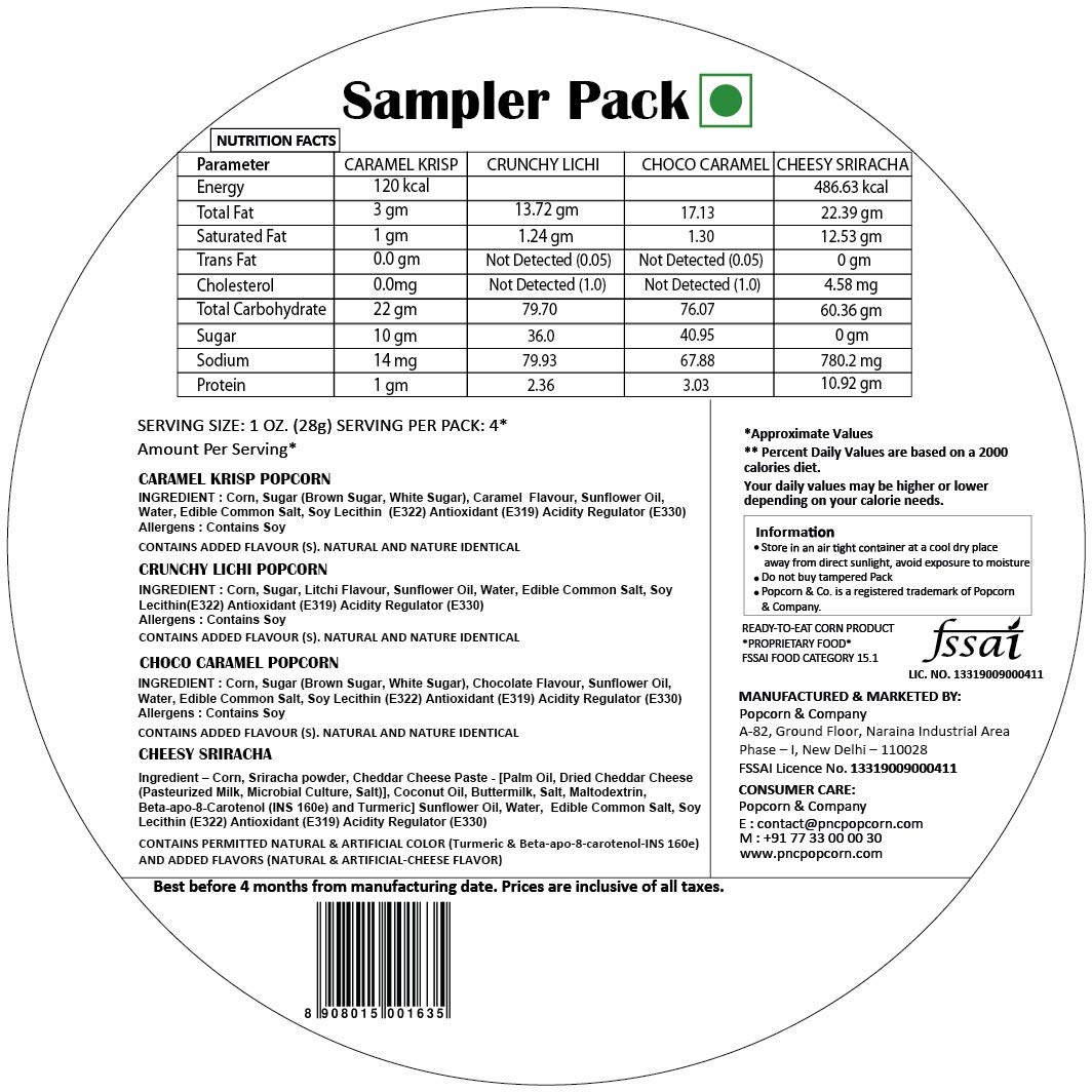 Popcorn & Company Sampler Pack Regular Tin 130 GM (Caramel Krisp Popcorn Chocho Caramel Popcorn Crunchy Lichi Popcorn Cheesy Sriracha Popcorn)