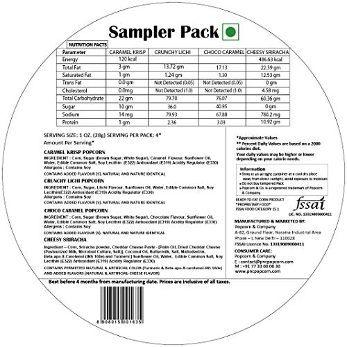 Popcorn & Company Sampler Pack Regular Tin 130 GM (Caramel Krisp Popcorn Chocho Caramel Popcorn Crunchy Lichi Popcorn Cheesy Sriracha Popcorn)