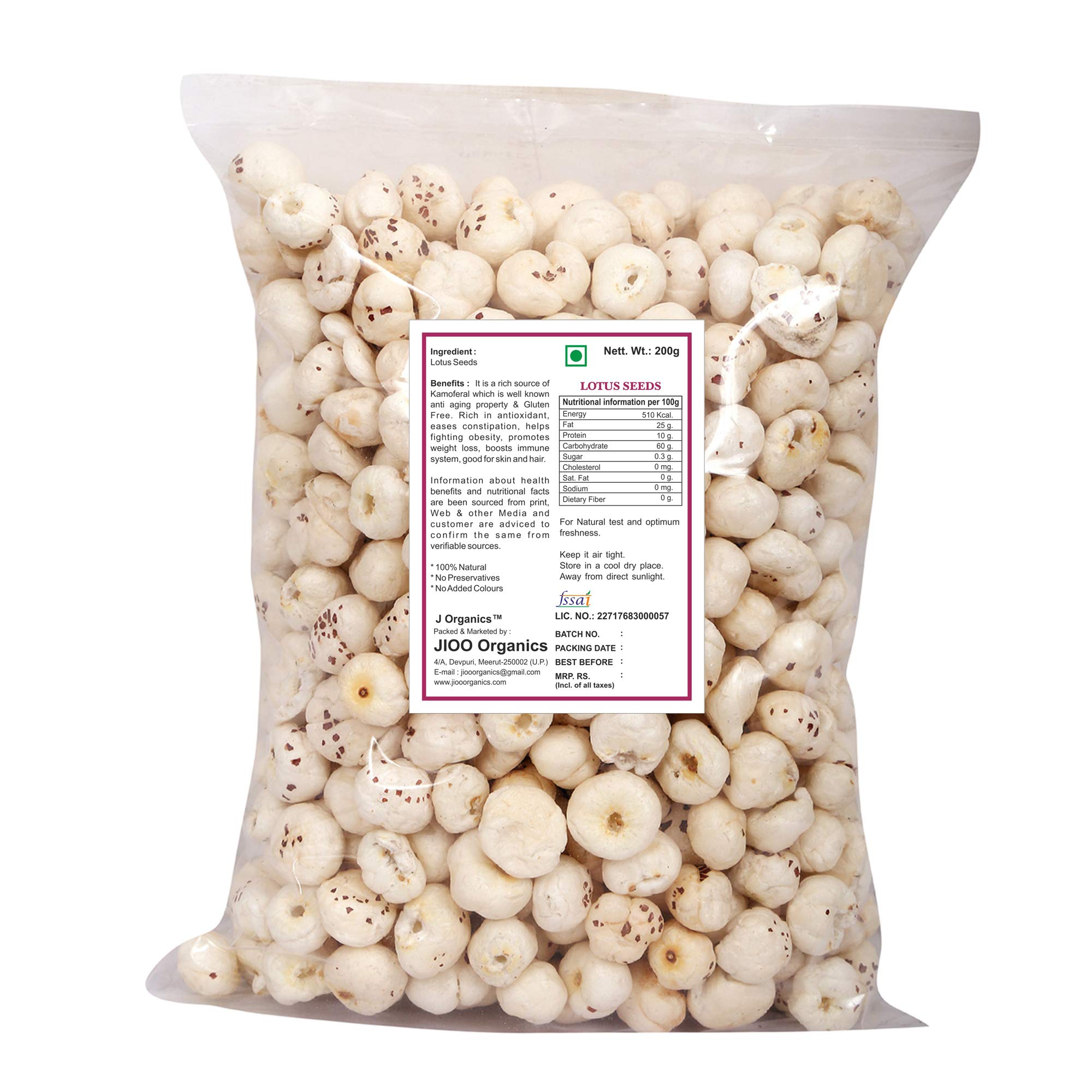 Indulge in the exquisite taste and superior quality of JOrganics Lotus Seed Handpicked Puffed Kernels. Carefully selected and processed these lotus seeds also known as Gorgon nuts or Fox Nuts offer a delightful crunch and rich flavor. Packed with essential nutrients vitamins and minerals they make for a nutritious and wholesome snack option for all occasions. Whether you're looking for a guilt-free snack a versatile ingredient for cooking and baking or a healthy addition to your trail mix our Chuare Dry Fruit Fox Nuts fit the bill perfectly. Each pack contains 200 grams of premium-quality Fox Nuts handpicked and processed to perfection. The generously-sized kernels ensure a satisfying crunch with every bite making them a favorite among health-conscious individuals and food enthusiasts alike. Plus our resealable packaging keeps the Fox Nuts fresh and flavorful for longer allowing you to enjoy them whenever and wherever you please. Elevate your snacking experience with JOrganics Lotus Seed Handpicked