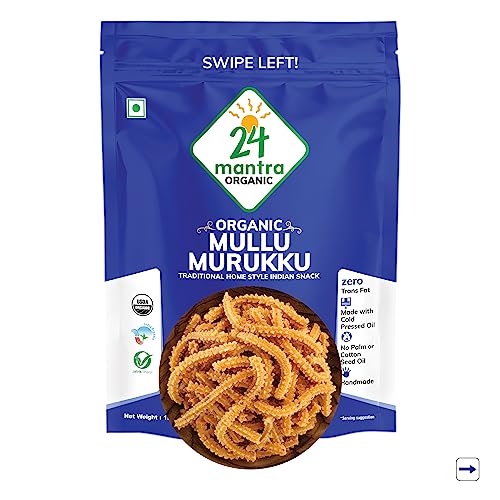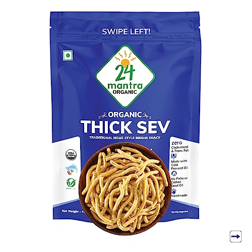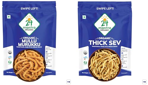 24 Mantra Organic Thick Sev 150gIndulge in the delicious taste and crunchy texture of our thick sev a popular traditional Indian snack. Made from premium-quality gram flour and seasoned with a blend of authentic Indian spices our thick sev is a perfect snack for anyone who loves the bold and vibrant flavors of Indian cuisine.24 Mantra Organic Mullu Mrurkku 150gExperience the authentic taste of organic mullu murukku a crispy and crunchy traditional Indian snack made from organic ingredients. Perfect for snacking on the go or with your favorite beverage this delicacy is sure to delight your taste buds.