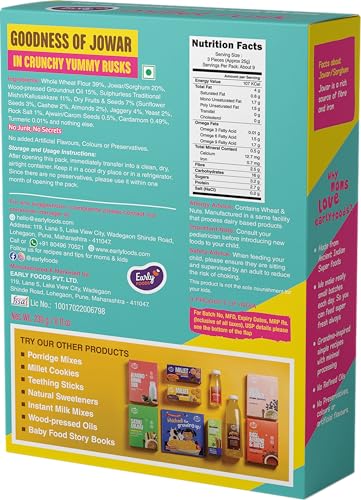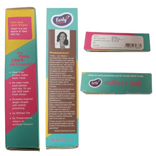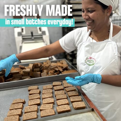 ZERO JUNK PROMISE: Early Foods Millet toast biscuits are a guilt-free snack as it contains no maida no refined oil maltodextrin emulsifiers preservatives or additives! Made with honest ingredients just like your home's kitchen.