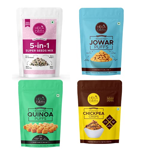 Heka Bites Healthy Snacks Box | 5-in-1 seeds | Combo of Quinoa Puffs - Indian Chaat Jowar Puffs - Cheesy Salsa Chickpea Crisps
