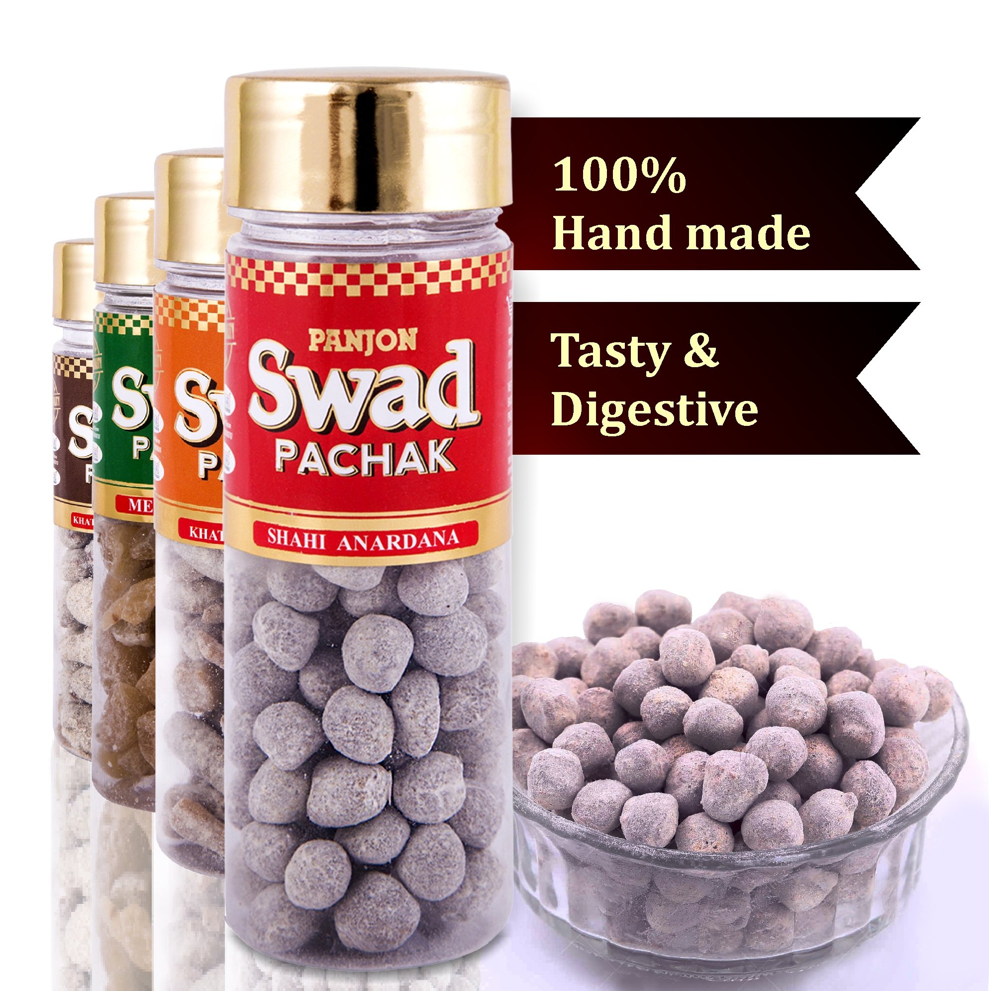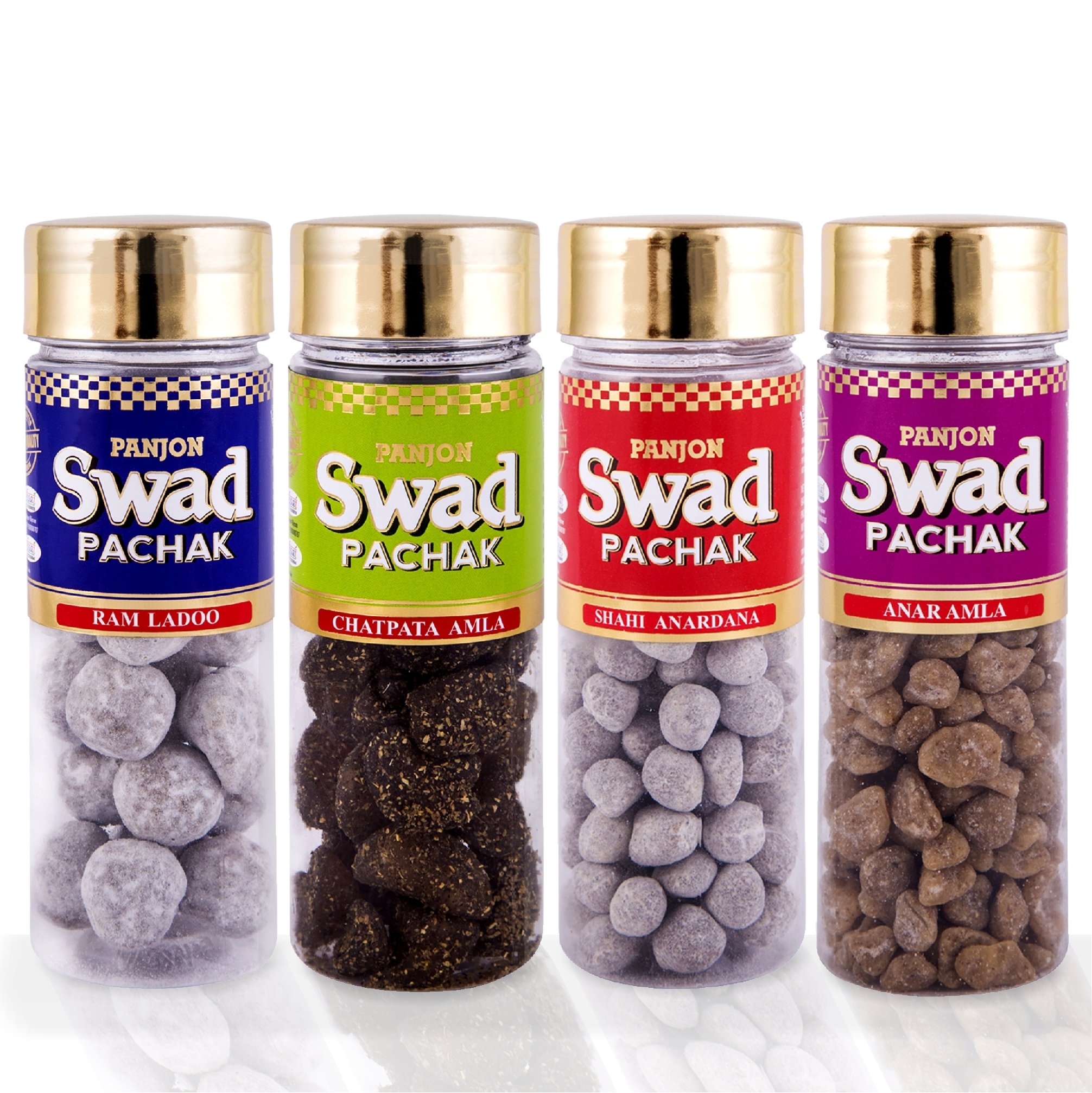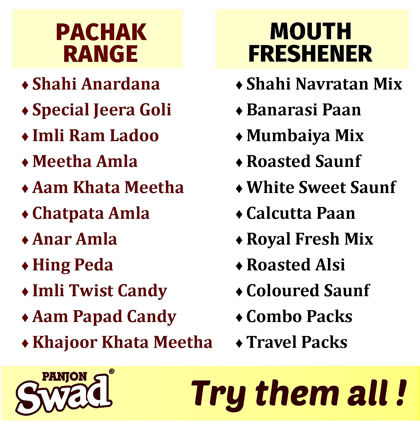 Swad the makers of Swad digestive drops candy present their premium range of mouth fresheners and pachak mukhwas to relish your cravings for tingling taste and mouth-watering aroma. Infused with the goodness of handpicked fruits and best quality condiments Swad pachak stimulates the digestive enzymes and acts as an appetizer. It strengthens the digestive process and also promotes absorption of nutrients to cure stomach disorders like acidity gas and indigestion. Swad pachak's handpicked ingredients boost your immune system to keep you charged up all day. Swad pachak mouth fresheners range includes 20 flavours: (try all) shahi anardana special jeera goli white sweet saunf colored saunf roasted alsi Rajasthan roasted saunf shahi banarasi paan special Calcutta paan royal fresh mix shahi navratan mix anar amla khatta meetha khajoor ram ladoo khatta meetha aam papar mumbaiya mix mukhwas hing peda meetha amla chatpata amla chulbuli tamarind imli aam papar mango slices and many more. Also available combo offer packs and festive offer packs. We guarantee finest quality ingredients in each bottle of Panjon Swad pachak and mouth freshener. Try all our 20 flavours to tickle your taste buds. To maintain freshness shake the bottle upside down and keep it in a cool and dry place.