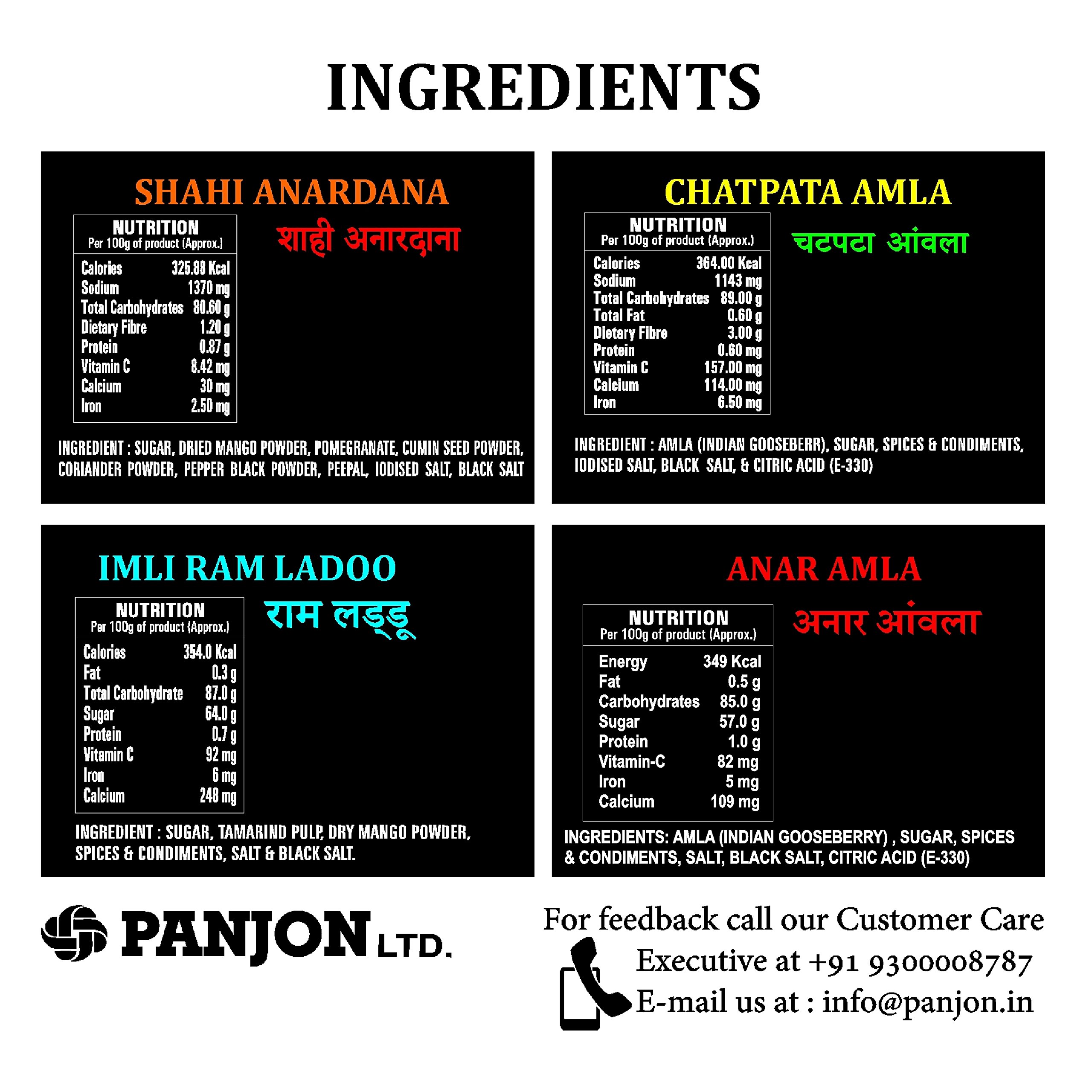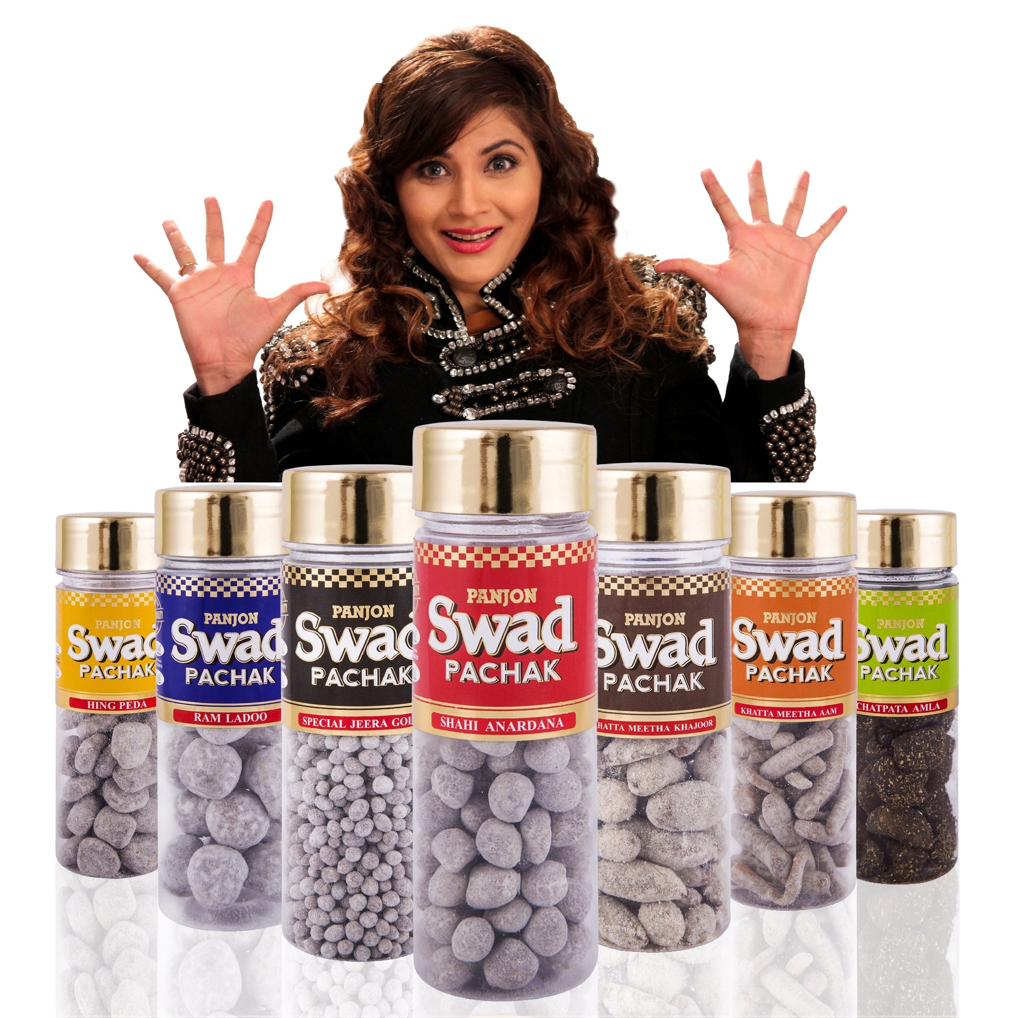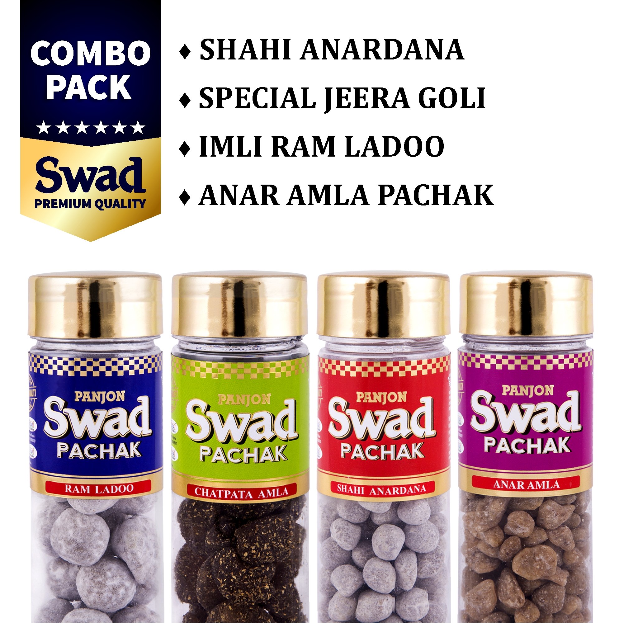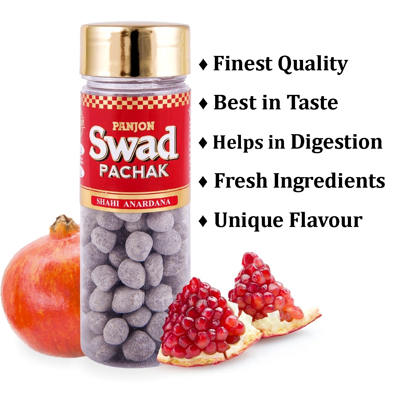 Swad the makers of Swad digestive drops candy present their premium range of mouth fresheners and pachak mukhwas to relish your cravings for tingling taste and mouth-watering aroma. Infused with the goodness of handpicked fruits and best quality condiments Swad pachak stimulates the digestive enzymes and acts as an appetizer. It strengthens the digestive process and also promotes absorption of nutrients to cure stomach disorders like acidity gas and indigestion. Swad pachak's handpicked ingredients boost your immune system to keep you charged up all day. Swad pachak mouth fresheners range includes 20 flavours: (try all) shahi anardana special jeera goli white sweet saunf colored saunf roasted alsi Rajasthan roasted saunf shahi banarasi paan special Calcutta paan royal fresh mix shahi navratan mix anar amla khatta meetha khajoor ram ladoo khatta meetha aam papar mumbaiya mix mukhwas hing peda meetha amla chatpata amla chulbuli tamarind imli aam papar mango slices and many more. Also available combo offer packs and festive offer packs. We guarantee finest quality ingredients in each bottle of Panjon Swad pachak and mouth freshener. Try all our 20 flavours to tickle your taste buds. To maintain freshness shake the bottle upside down and keep it in a cool and dry place.