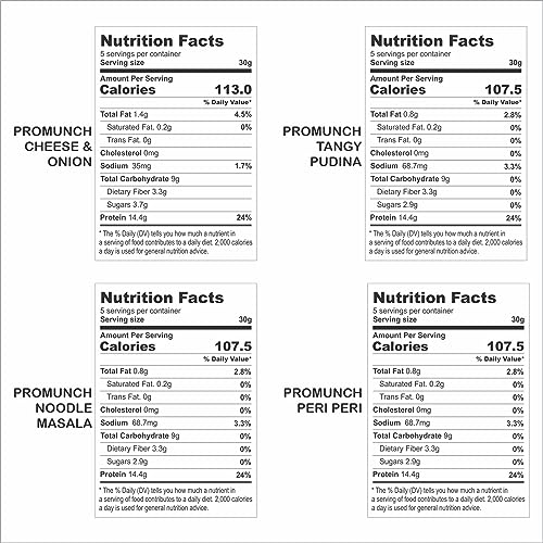 PROMUNCH Roasted Soya Snack | High-Protein | Healthy | Gluten-Free | Combo of 4 Packs Flavour: Cheese&OnionPeri-PeriNoodle Masala & Tangy Pudina 70 g Each