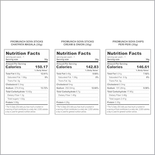 Elevate your snacking experience with the PROMUNCH Combo Pack featuring a delightful assortment of Soya Sticks and Soya Chips. Chatpata Masala Soya Sticks: Dive into the flavorful world of our Chatpata Masala sticks crafted with high-quality ingredients and bursting with zesty flavor. These sticks are free from palm oil and maida making them a health-conscious choice. Each crispy bite is rich in protein perfect for satisfying cravings any time of the day. Cream & Onion Soya Sticks: Enjoy the rich and savory taste of our Cream & Onion sticks. Made with the finest ingredients and no artificial preservatives these crunchy treats are a wholesome option that the whole family will love. Peri Peri Soya Chips: Experience a fiery flavor explosion with our Peri Peri chips delivering a spicy kick in every crunch. Packed with protein and free from artificial additives these chips are perfect for on-the-go munching or as a tasty addition to meals and salads. This versatile combo is ideal for parties movie nights or simply snacking at home. With each pack containing 32g of irresistible flavors None of these three products contain palm oil or Maida.