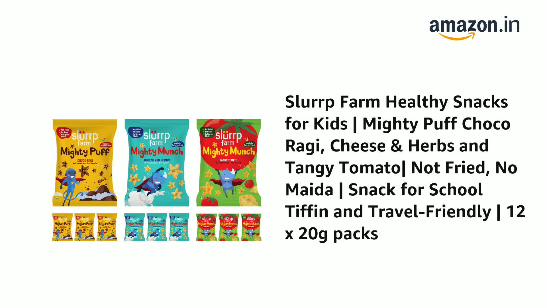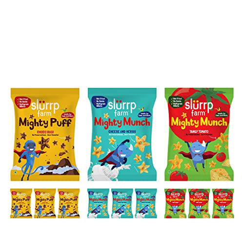 HomeGrocerySnacksHealthy SnacksSlurrp Farm Healthy Snacks for Kids | Mighty Puff Choco Ragi, Cheese & Herbs and Tangy Tomato| Not Fried, No Maida | Snack for School Tiffin and Travel-Friendly | 12 x 20g packs