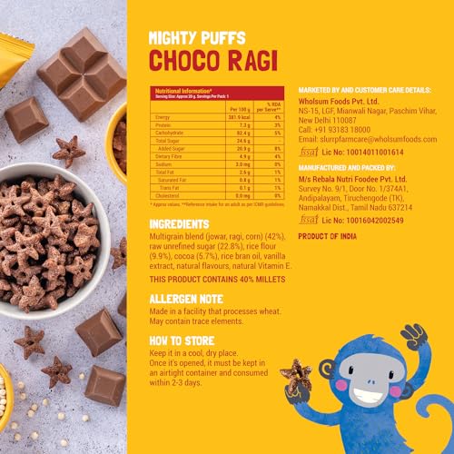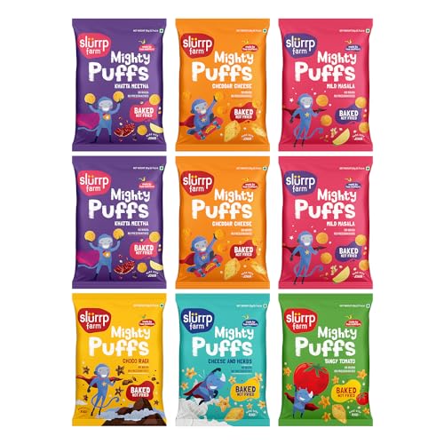 Slurrp Farm Mighty Jowar Puffs | Khatta Meetha Mild Masala Cheddar Cheese Tangy Tomato Choco Ragi Cheese & Herbs | Not Fried No Maida | Healthy Snack for Kids School Tiffin and Travel Friendly | 9 x 20g