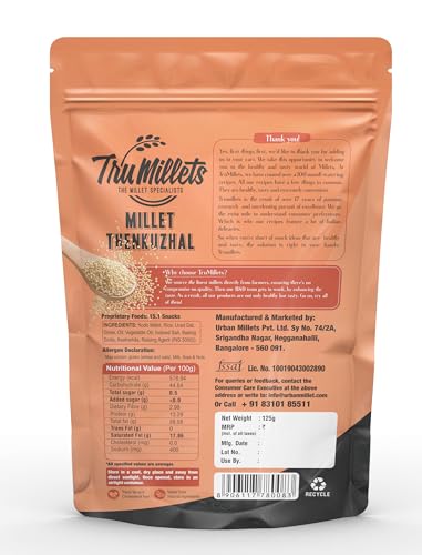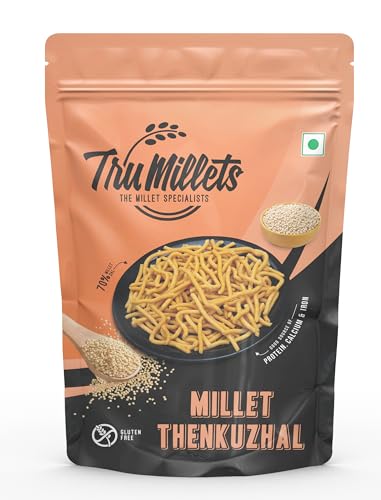 TruMillets Kodo Millet Thenkuzhal 125g is a deliciously crunchy and authentic South Indian snack crafted with the goodness of Kodo Millet for a healthy and nutritious twist. Made with wholesome natural ingredients including rice flour fried gram groundnut sunflower oil and aromatic spices this snack is minimally processed to retain its traditional taste and health benefits. Rich in protein fiber calcium and iron it is a perfect guilt-free indulgence with zero trans fat no added sugar and no palm oil. Enjoy this ready-to-eat crispy millet nippattu as a tea-time snack or a travel-friendly munch ensuring taste and health in every bite!